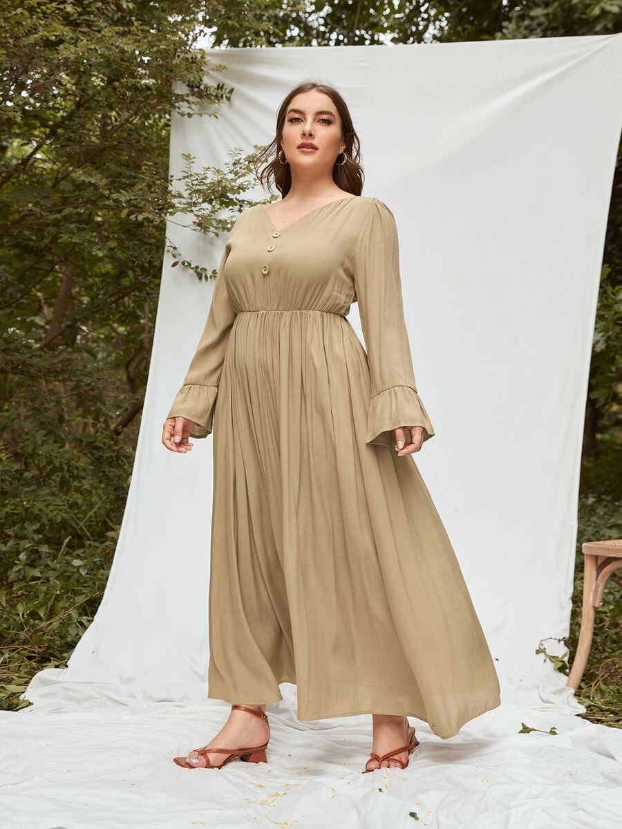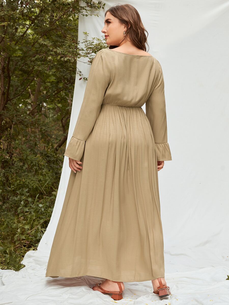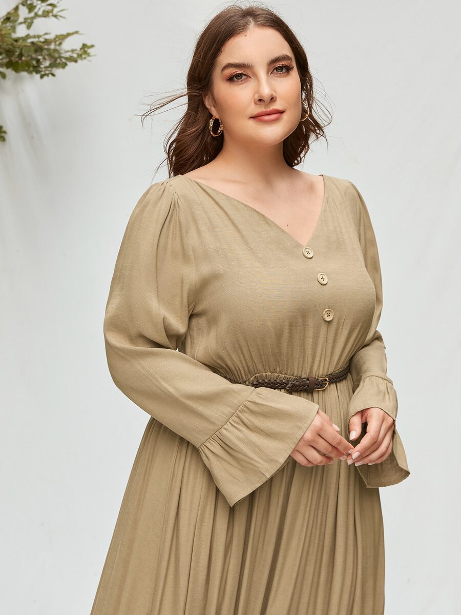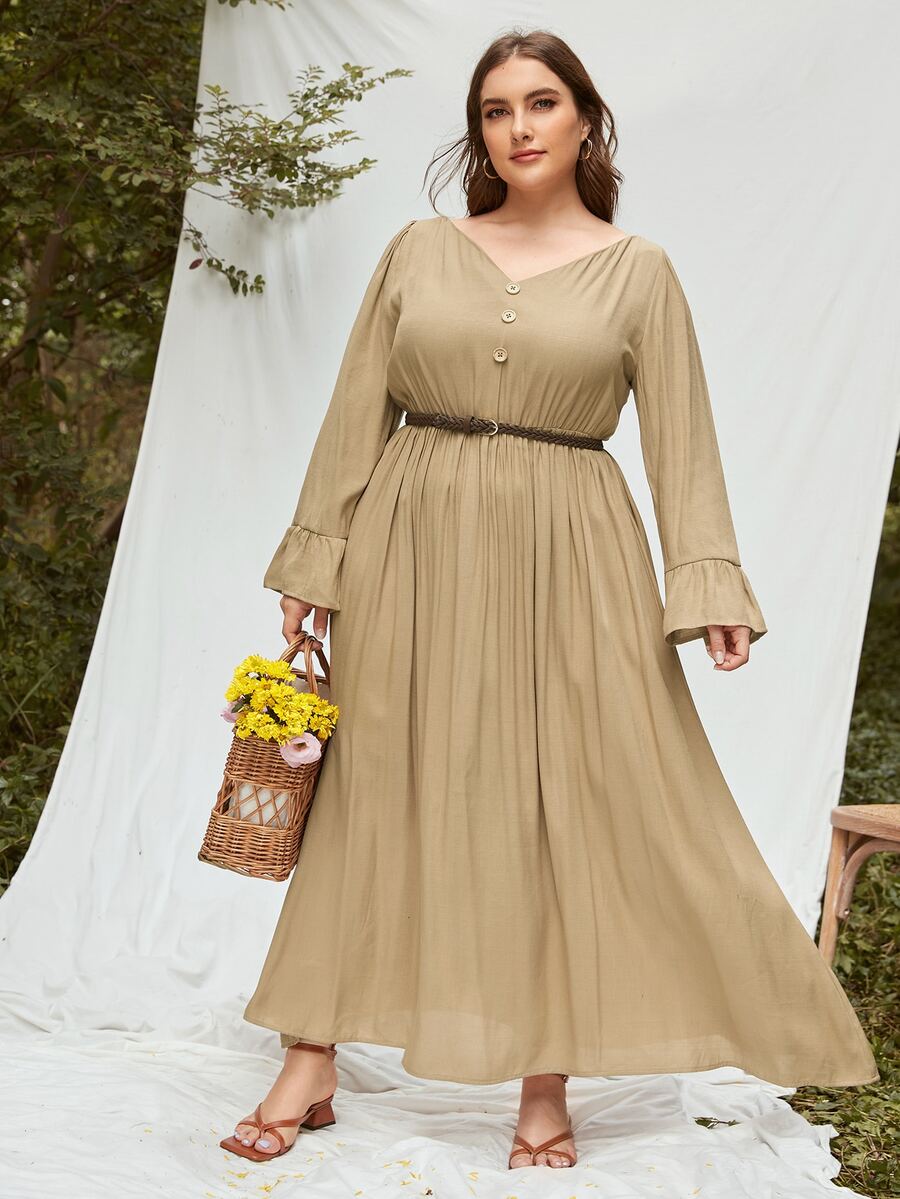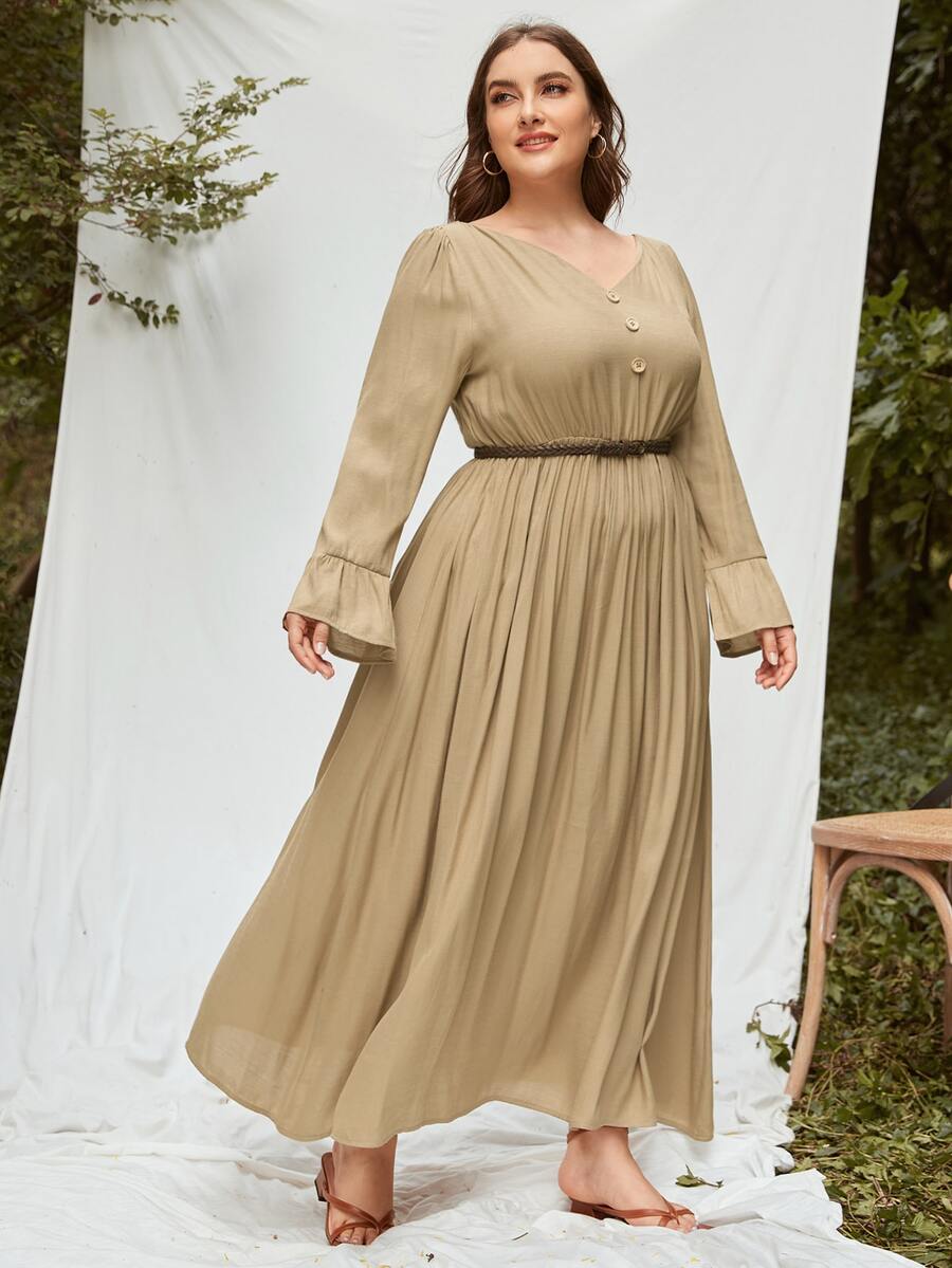 Plus V-neck Flounce Sleeve Dress Without Belt