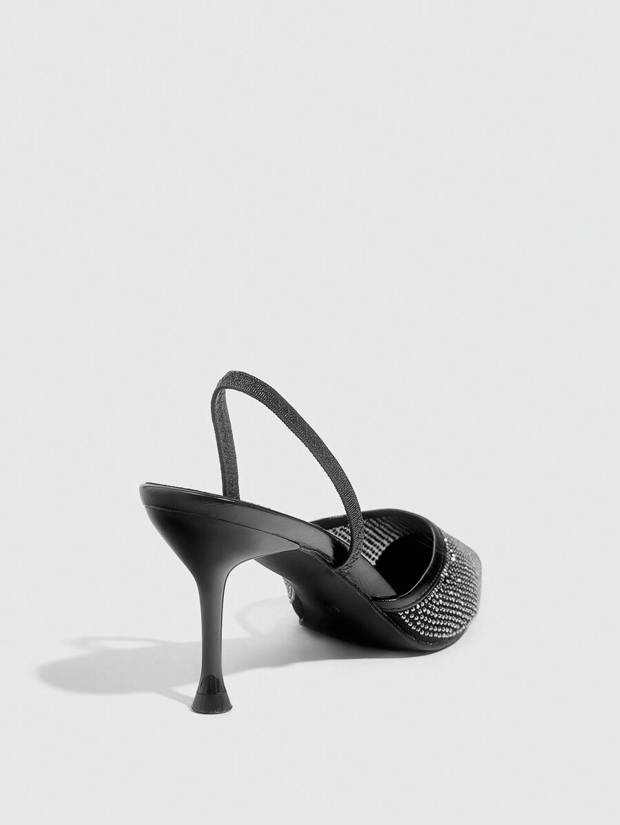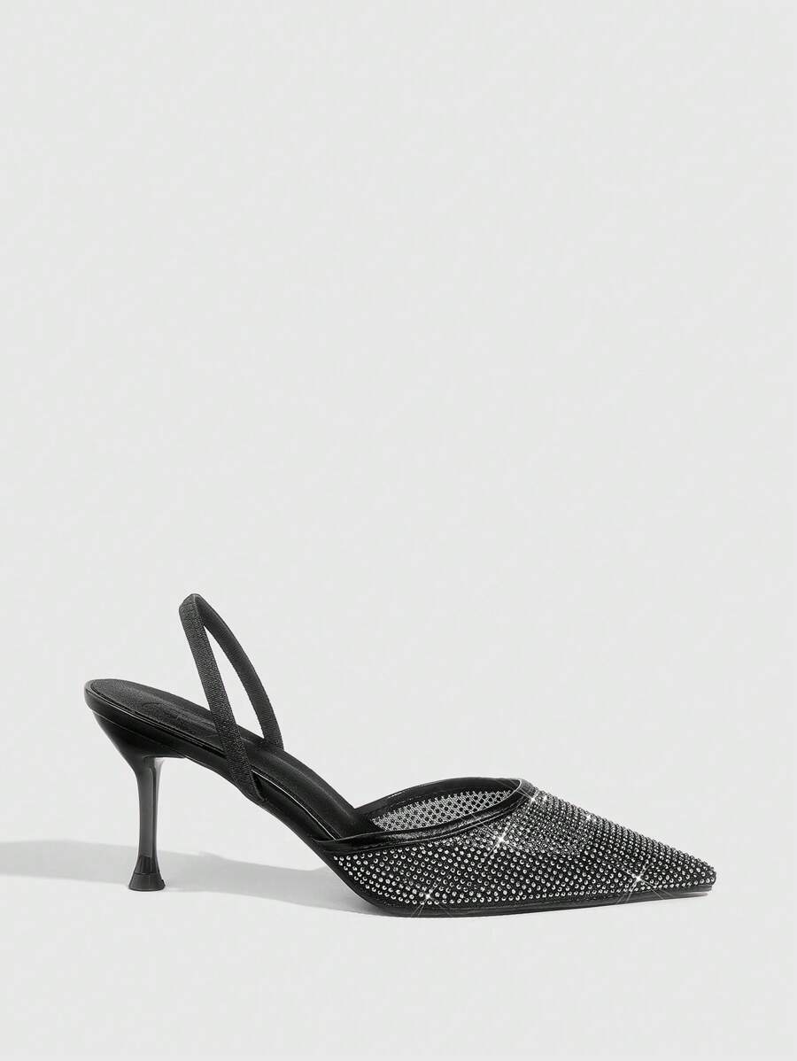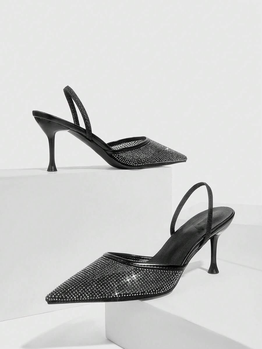 Pointed Toe Crystal Embellished Hollow Out Transparent Mesh High Heel Mule Shoes For Women Valentine's Day