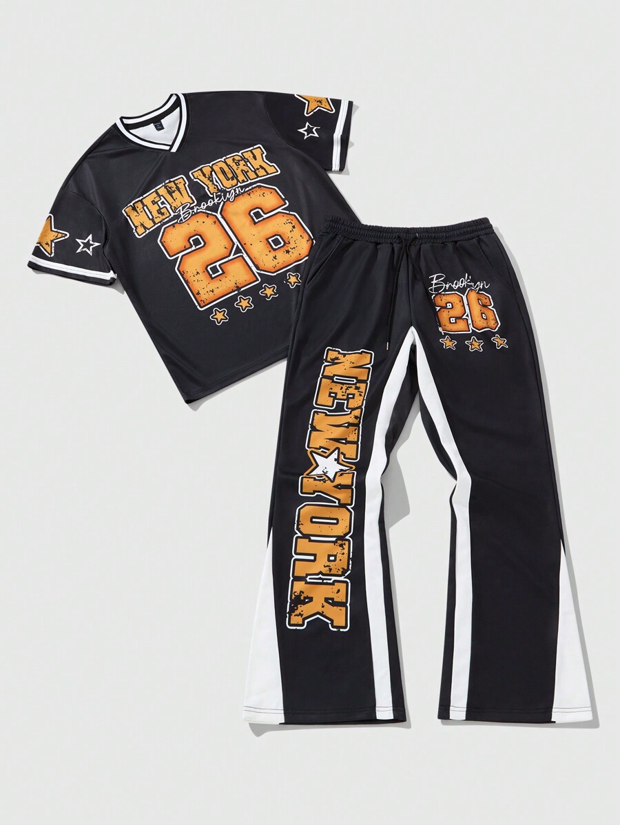 Street Life 2pcs Men's Brand Sports Letter Print Short Sleeve Football Jersey Style T-Shirt And Drawstring Long Pants Set