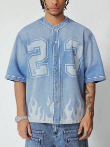 Prep Men's Front Button Short Sleeve Casual Denim Shirt With Number Print