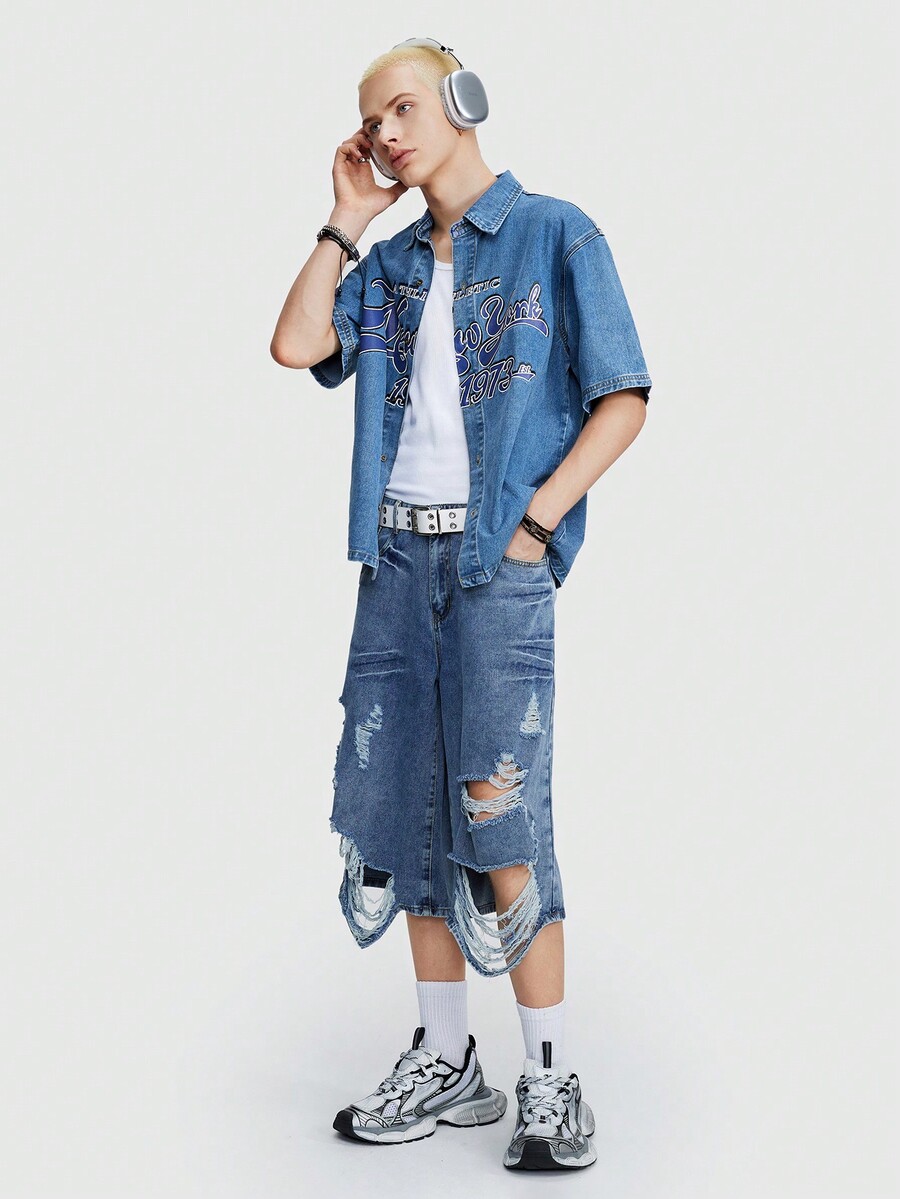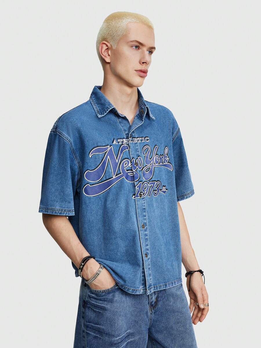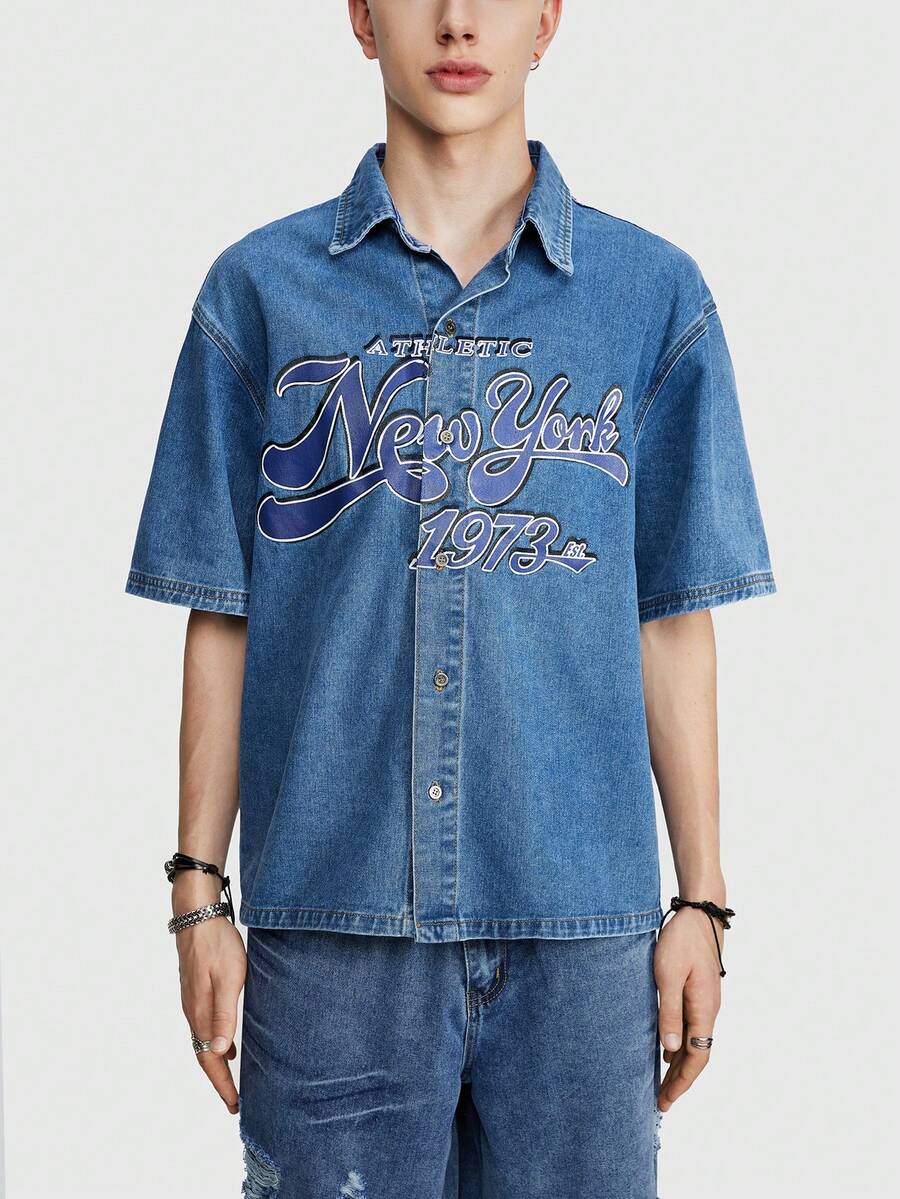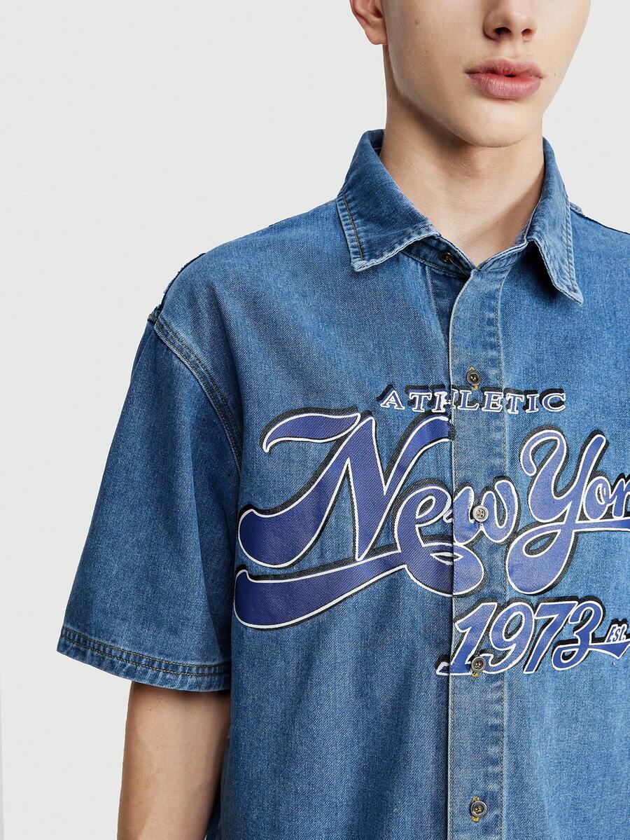 Prep Men's New York Printed Drop Shoulder Denim Shirt