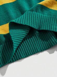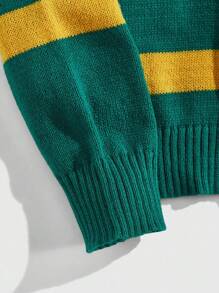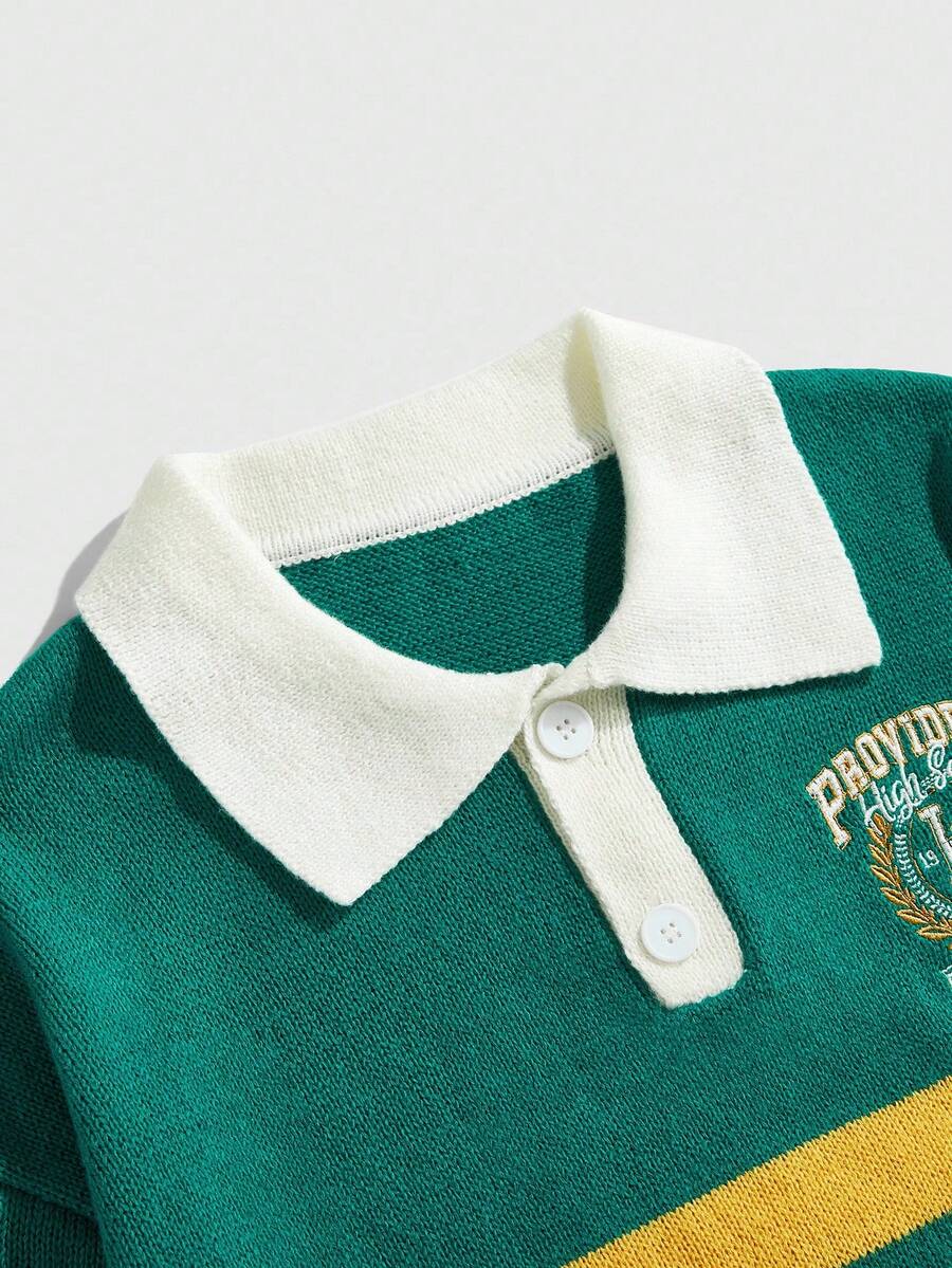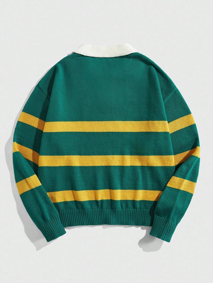 Prep Men's Polo Collar Varsity Style Badge Striped Knit Sweater, College Youthful Fashion , Fall Winter