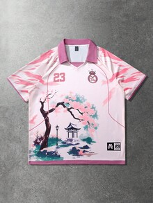 Prep Spring/Summer Casual Graphic Pink Men'S Polo Shirt, Casual Sports Sakura & English Text Graphic Print Short Sleeve Polo Shirt