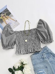 Puff Sleeve Shirred Frill Trim Gingham Peplum Top Peplum Top