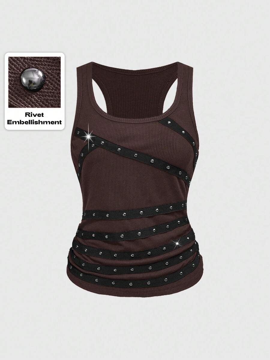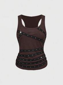 Grunge Punk Punk Rock Studded Sleeveless Crop Top & Vest, Sexy Studded Strap Summer College Style, Plus Size