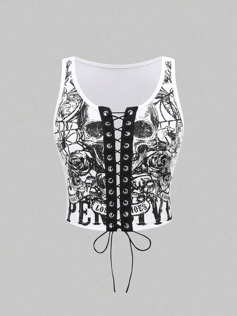 Goth Punk Skull Print Eyelet Lace-Up Casual Versatile Women Tank Top, Suitable For Concert/Festival, Halloween