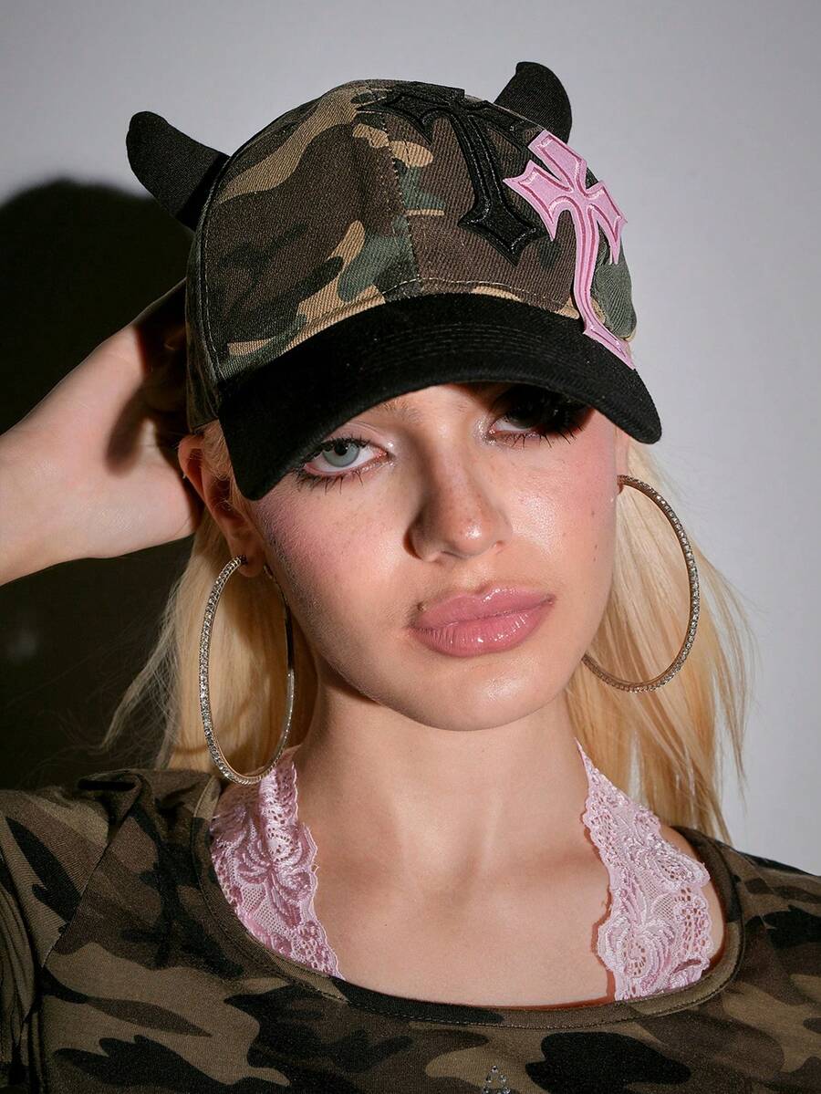 ROMWE Avant 1pc Punk Rock Style Black & Pink Cross Devil Horn Element Baseball Cap, Y2K Design Sense Camo Print Black Brim Snapback Hat, Daily Personalized Fashion Item
