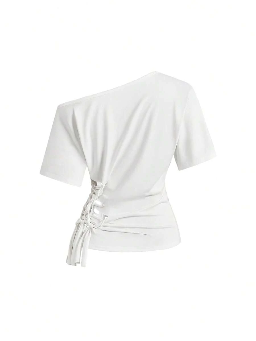 ROMWE Avant Asymmetric Neckline American Flag Print Perforated Drawstring T-Shirt