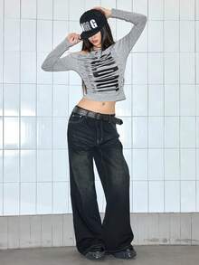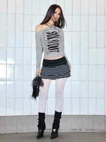 ROMWE Avant Blurred Slogan Print Distressed Shoulder Fitted T-Shirt