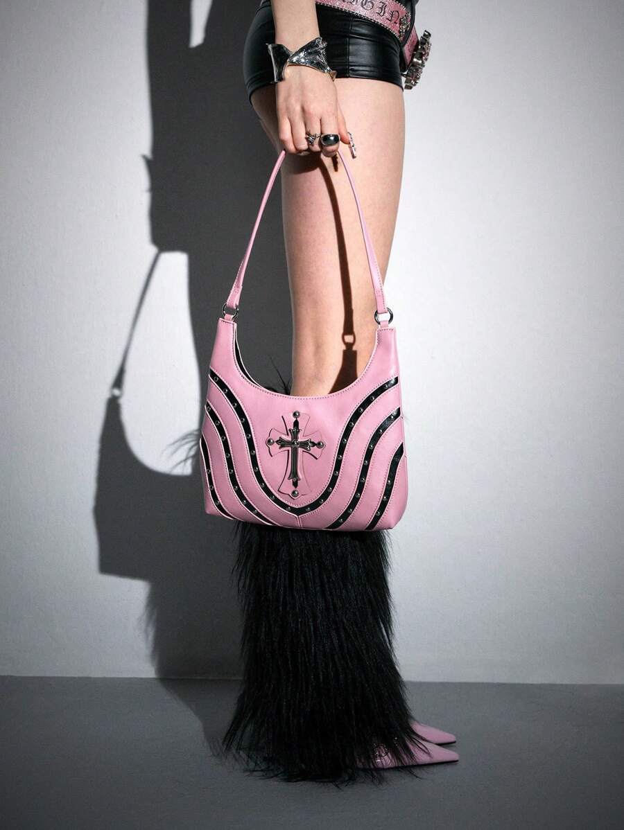 ROMWE Avant Classic Rocker Chic Studded Shoulder Tote Bag, Casual Motorcycle Style Fashion Gothic Handbag For Women