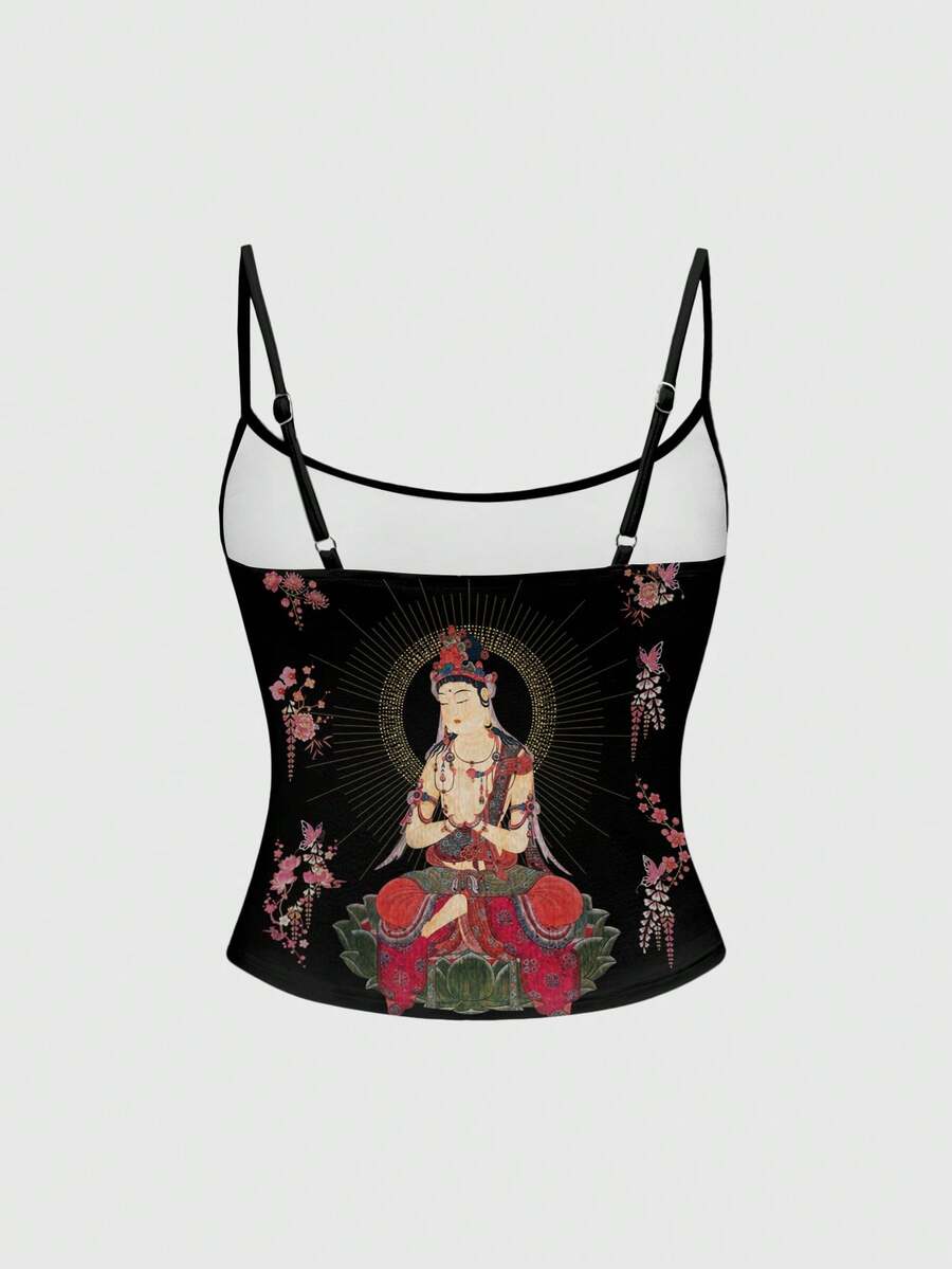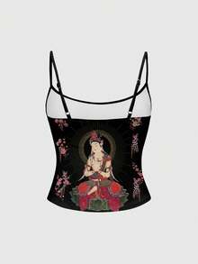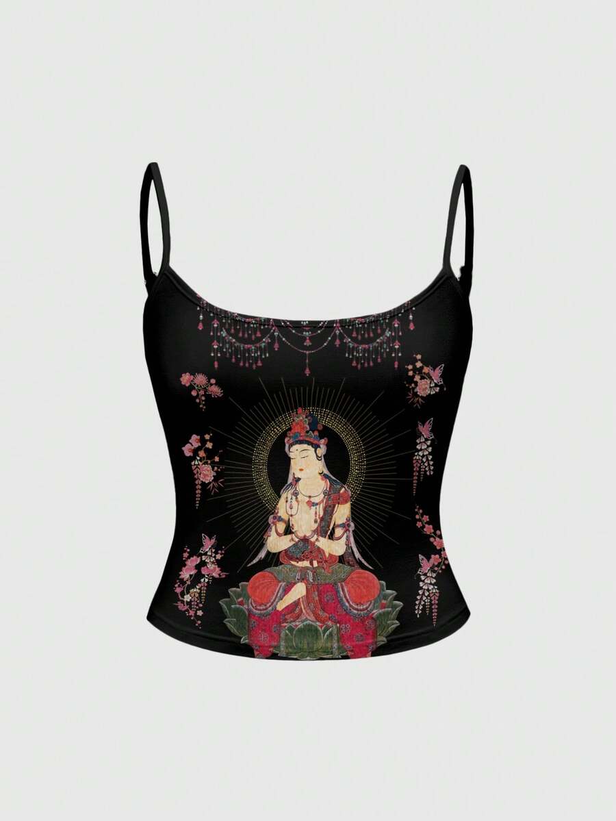 ROMWE Avant Dark Mysterious Neo-Chinese Style Religious Buddhist Dark Vintage Rose Flower Music Festival Women Camisole