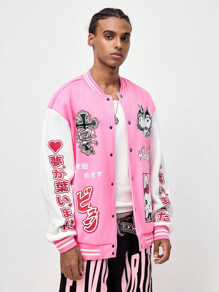 ROMWE Avant Men's Minimalist Print Button-Up Long Sleeve Baseball Jacket, School