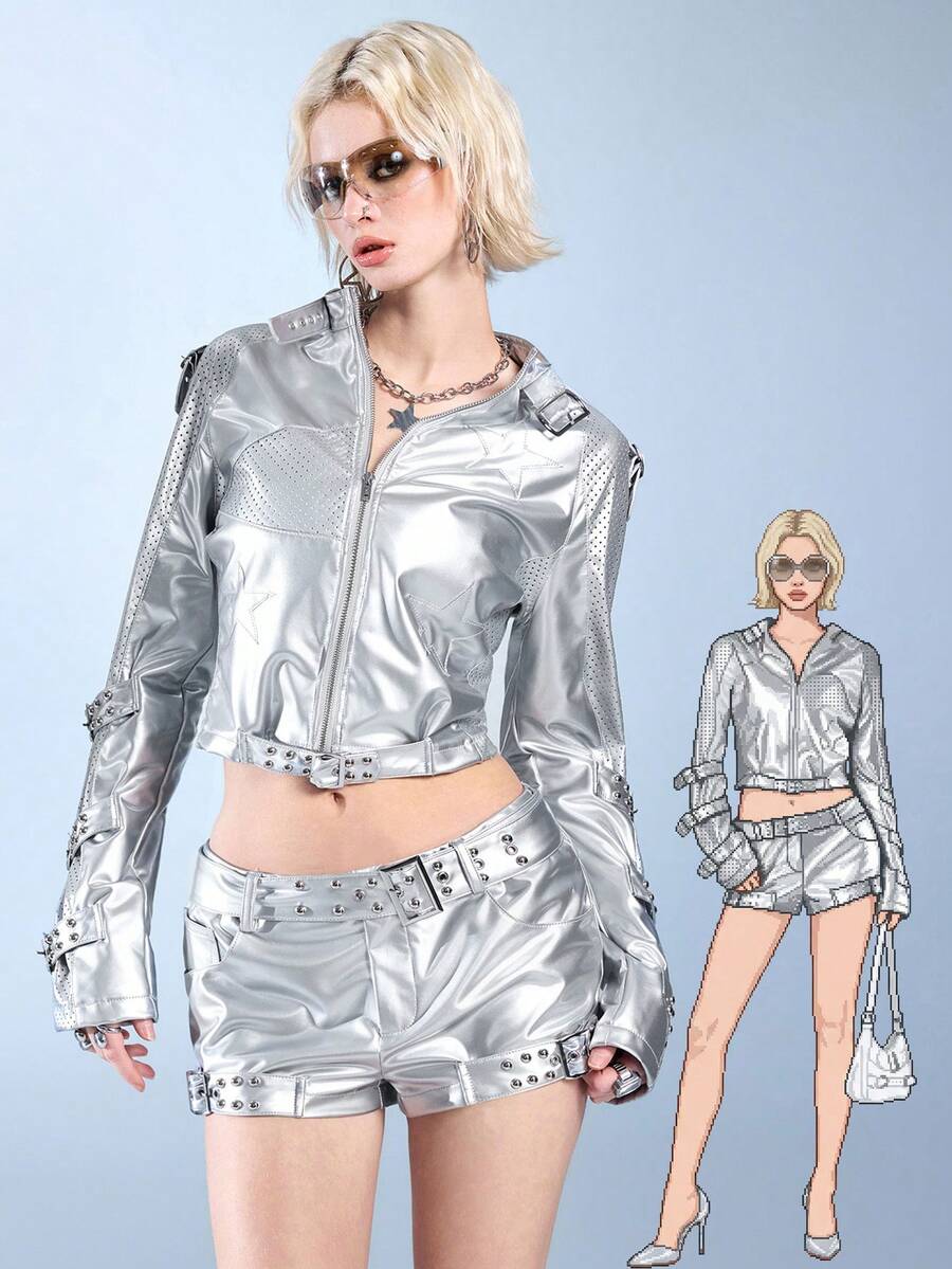 ROMWE Avant Retro Y3K Punk Racer Biker Style Casual Street PU Silver Fabric Short Women Jacket
