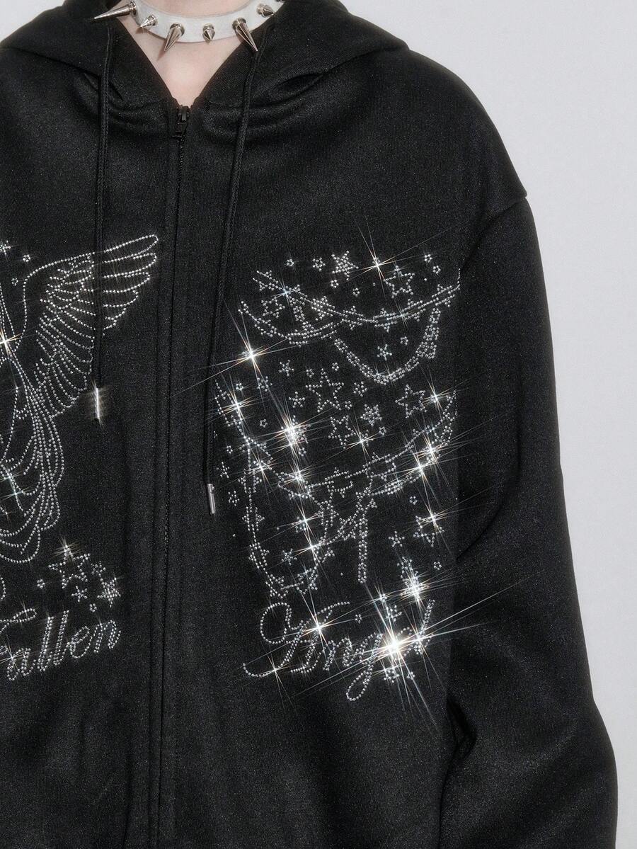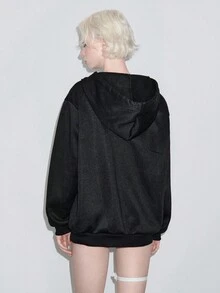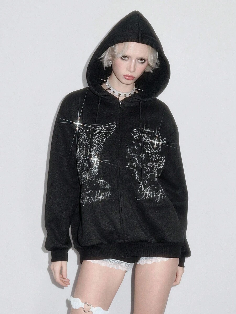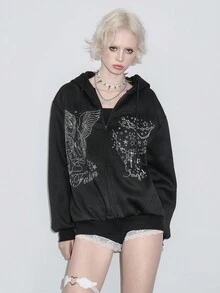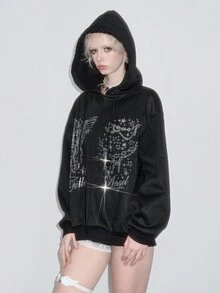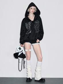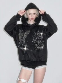 ROMWE Avant Streetwear Loose Fit Sweatshirt For Women With Star & Chain Graphic And Rhinestone Embellishment