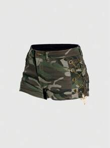 ROMWE Avant Vintage Washed Frayed Side Cross Metal Pendant Low Rise Mini Camo Denim Shorts