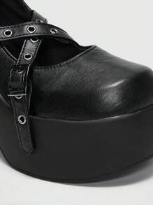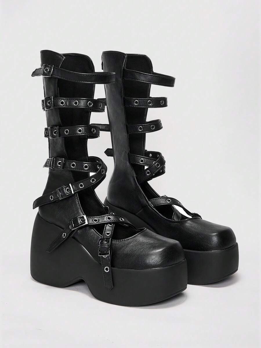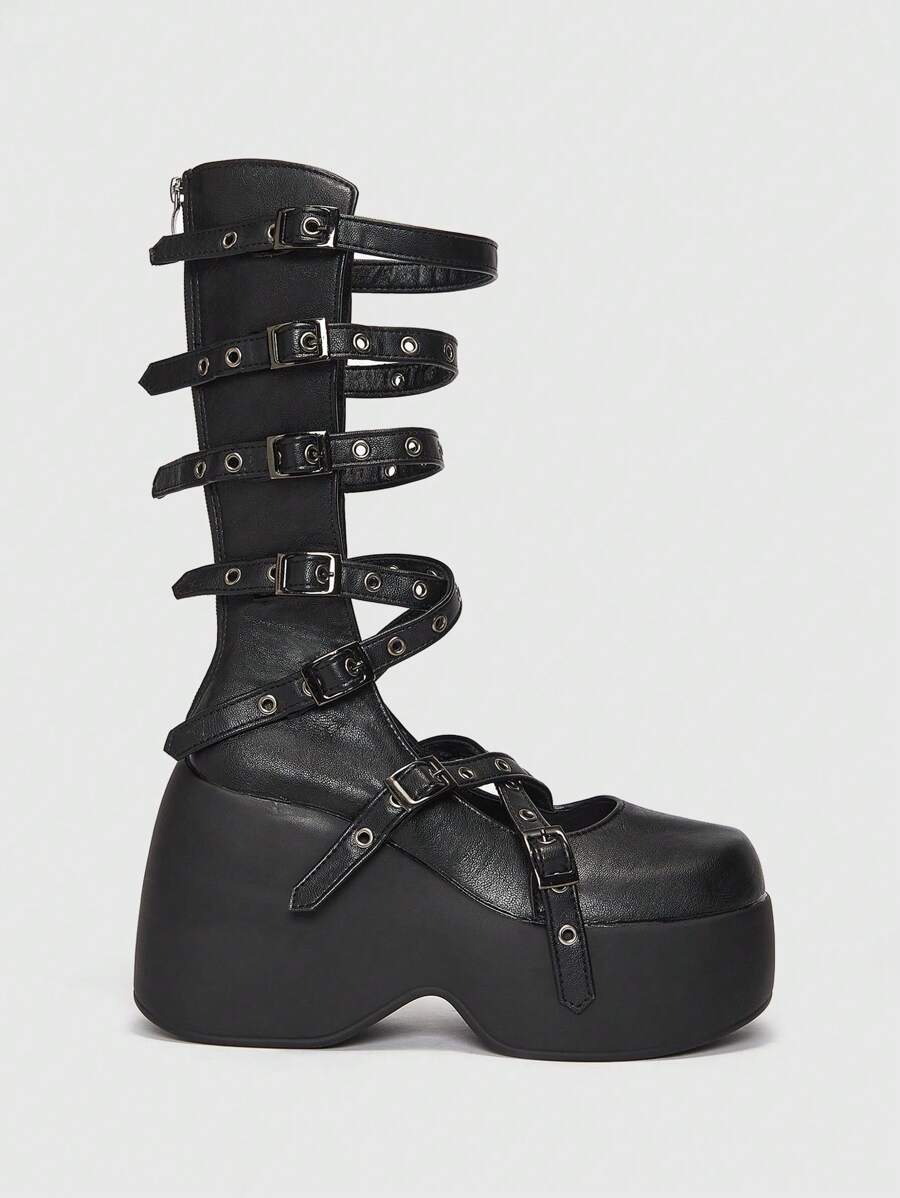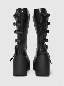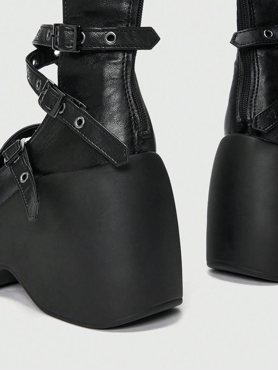 ROMWE Avant Women Buckle Decor Round Toe Wedge Boots, Punk Outdoor Fashion Boots