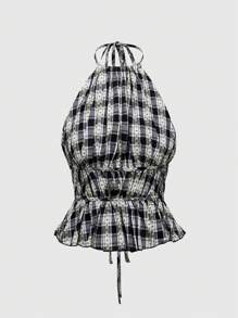 ROMWE Avant Women's Plaid Print Halter Neck Ruffle Hem Casual Camisole