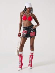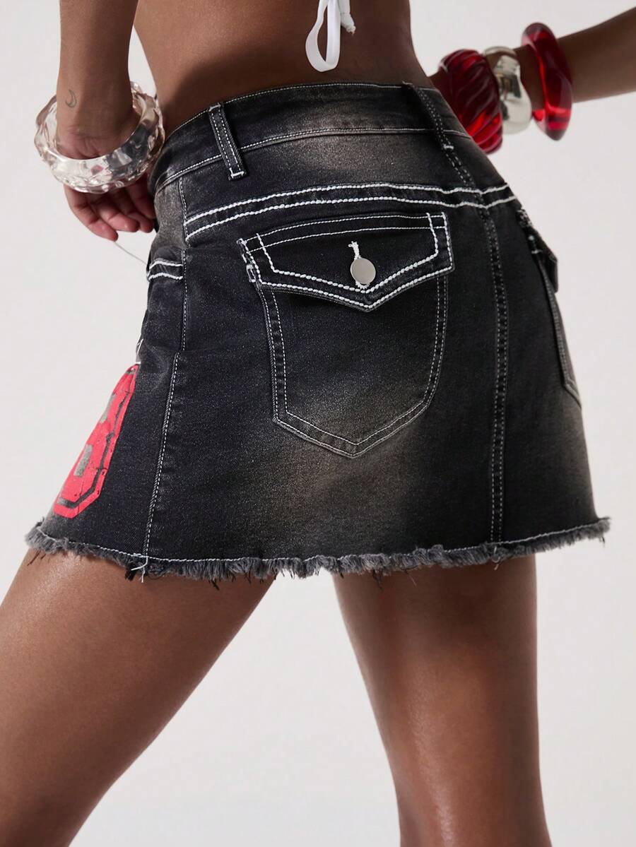 ROMWE Avant Women's Retro College Style Back To School Slogan Logo Embroidered Denim Bodycon Mini Skirt