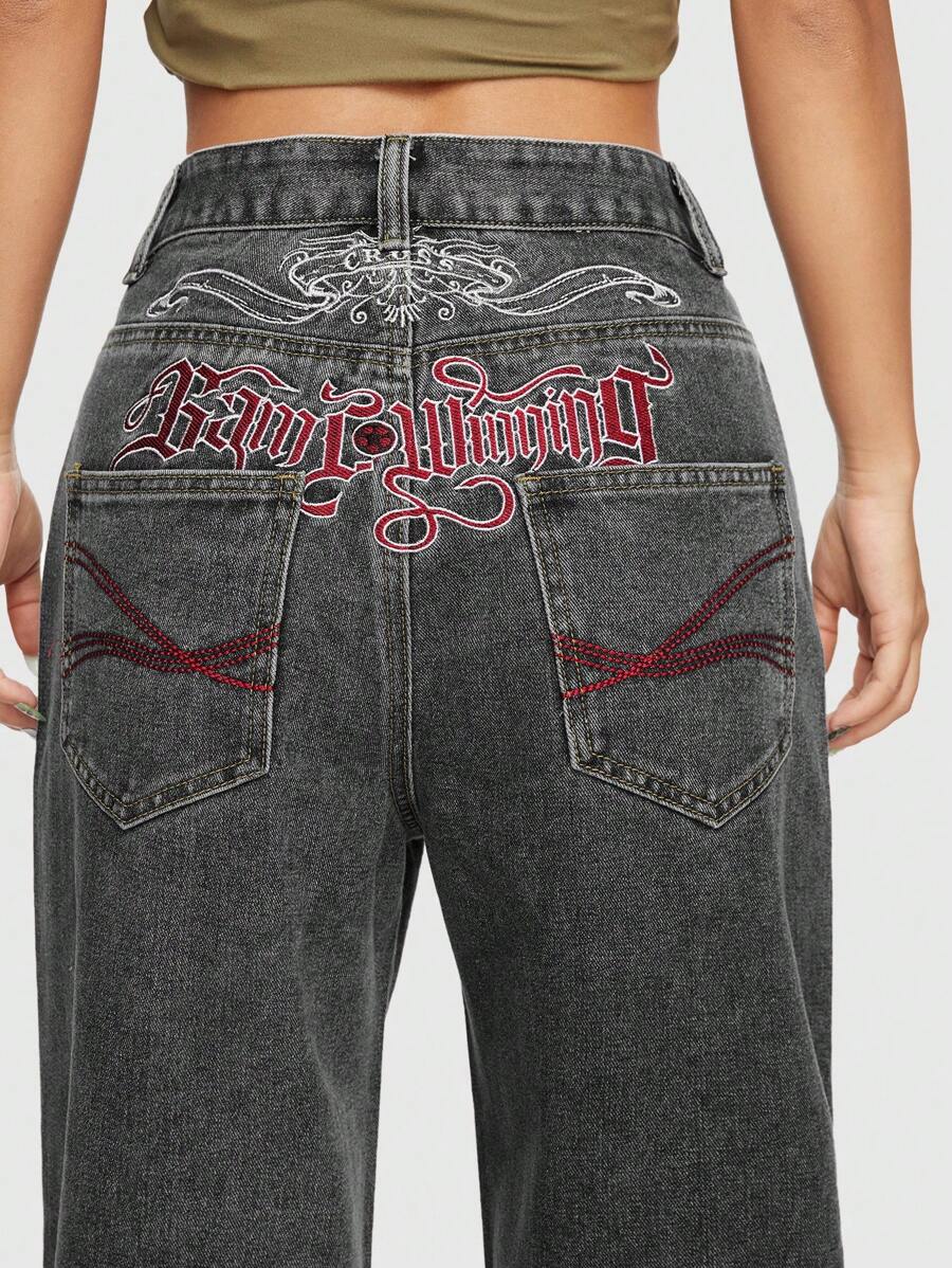 ROMWE Avant Women's Street Style Casual Straight Jeans With Slogan, Floral And Linear Embroidery, School Boy Friend Jeans