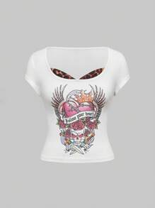 ROMWE Avant Women's Summer Graphic Tee With 2 In 1 Vintage Rhinestone Print Design