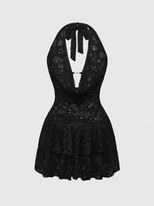 ROMWE Avant Y2K Modern Sexy Hot Girl Music Festival Outfit Deep Draped Neck Halter Backless Textured Fabric Mini Dress
