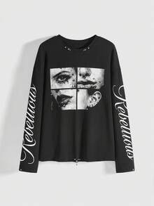 ROMWE Avant Y2K Streetwear Loose Fit Women T-Shirt With Retro Lip Slogan Graphic, Eyelets & Rivet Decor