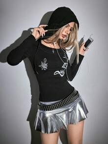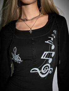ROMWE Avant Y2K Subculture Retro Street Music Note Print Long Sleeve Hooded 2 In 1 T-Shirt For Women