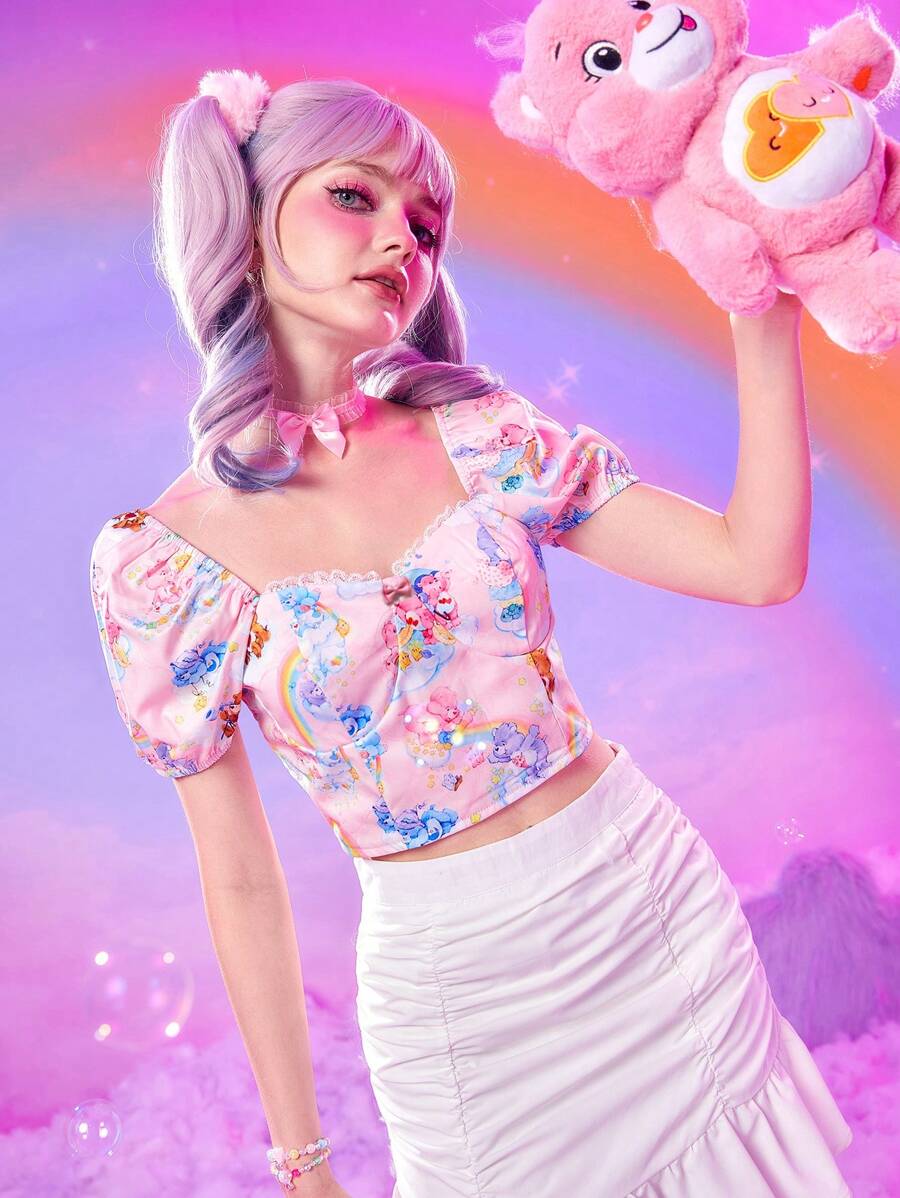 ROMWE X Care Bears Cartoon Graphic Puff Sleeve Crop Blouse