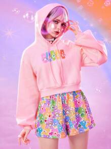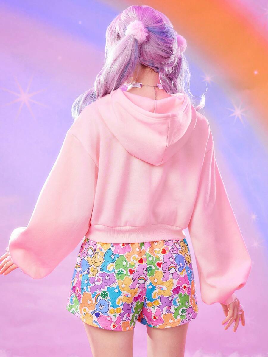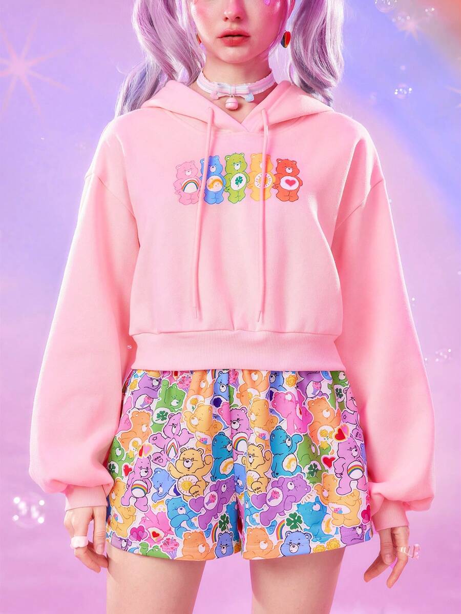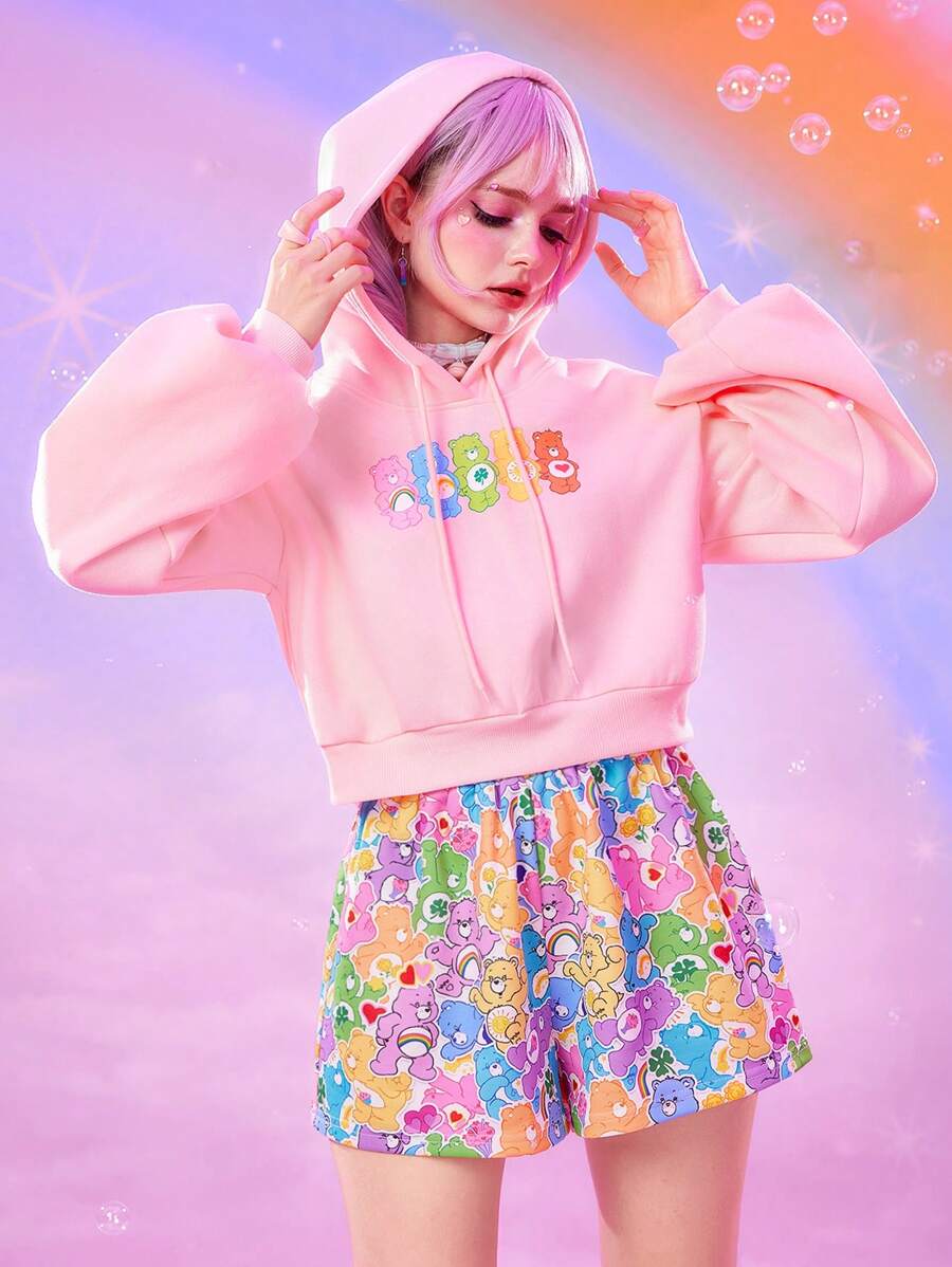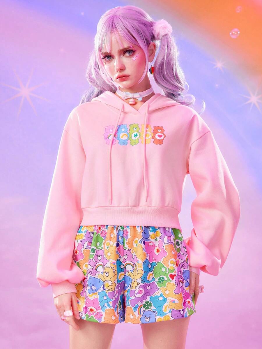 ROMWE X Care Bears Women's Casual Cute Cartoon Bear Print Dropped Shoulder Loose Drawstring Hooded Cropped Sweatshirt, Spring
