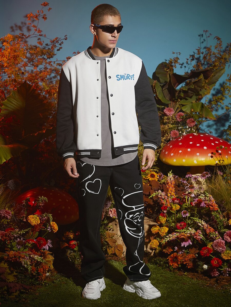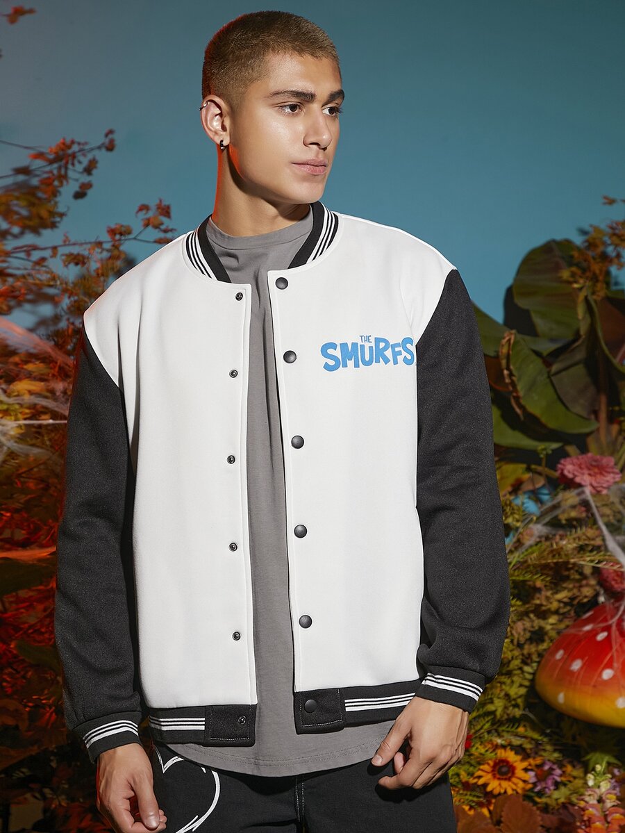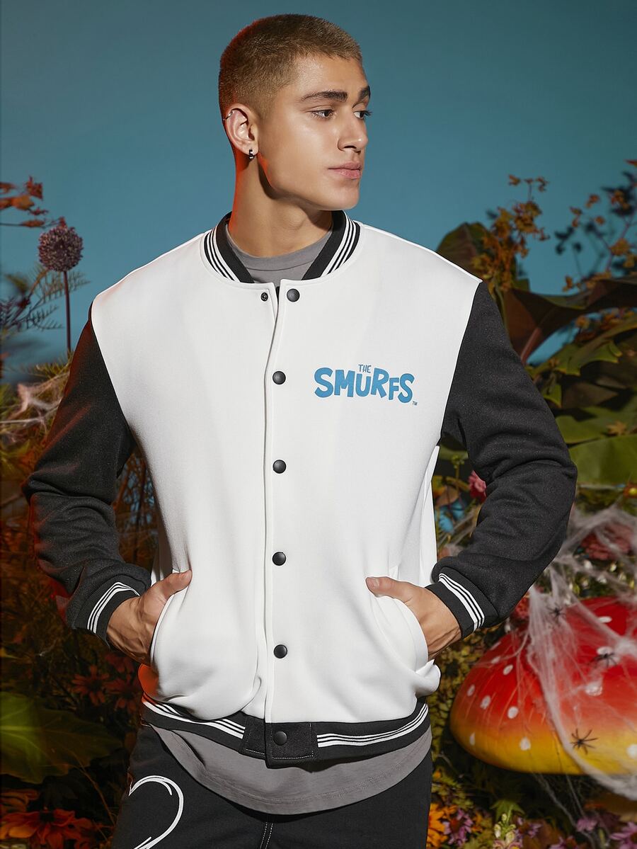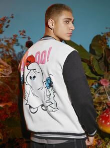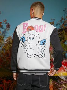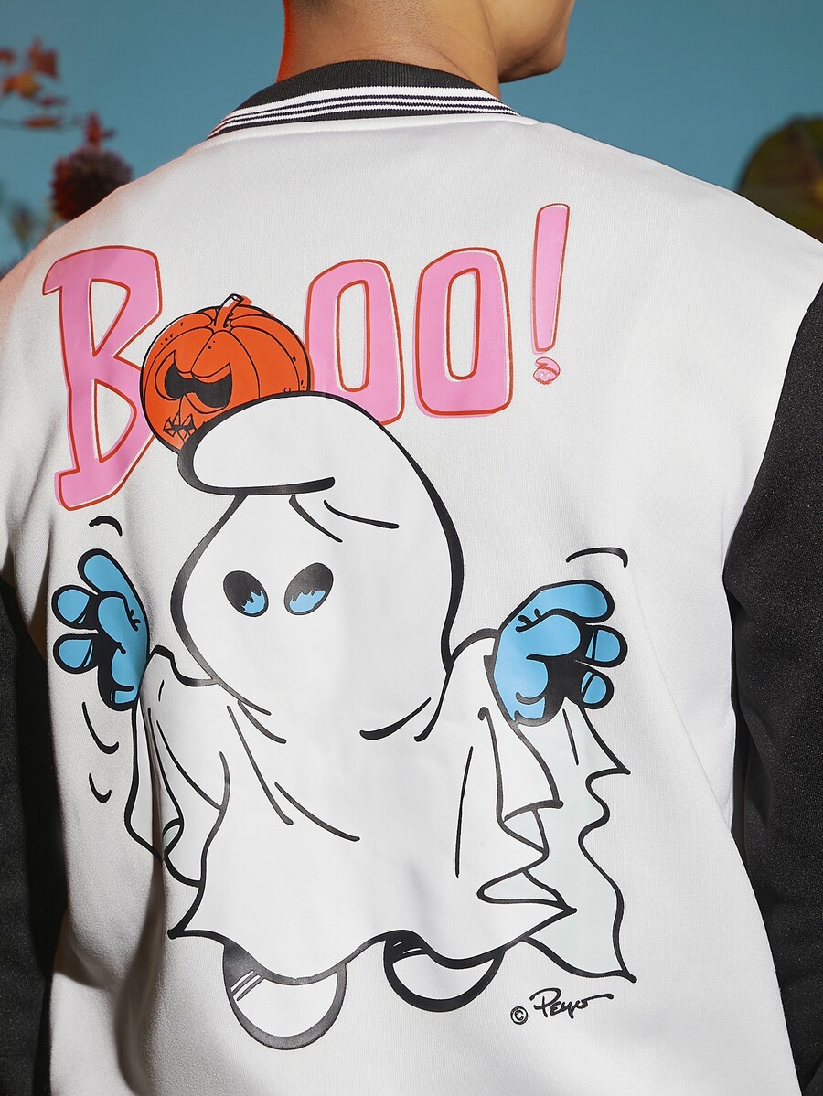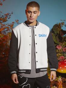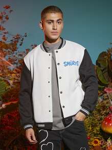 ROMWE X The Smurfs Guys Halloween Letter Cartoon Graphic Striped Trim Varsity Jacket