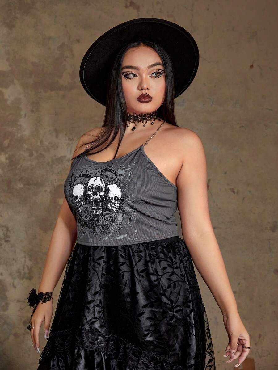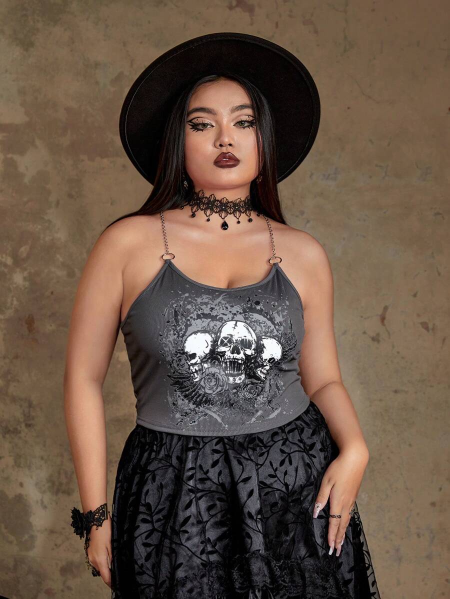 Goth Plus Skull Print Chain Detail Cami Top