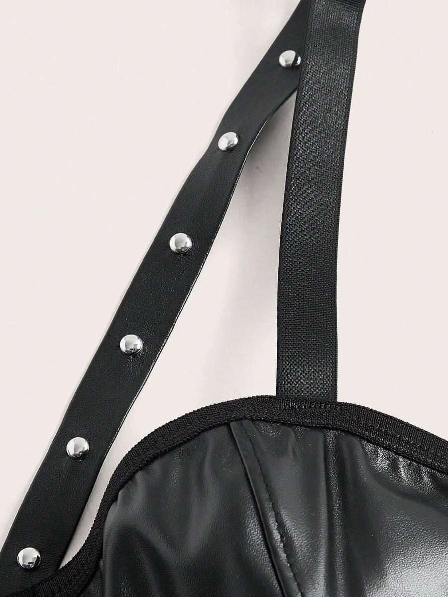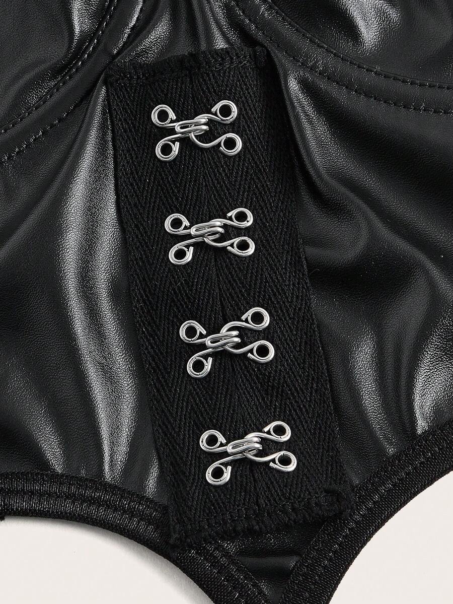 Grunge Punk Solid PU Leather Hook And Eye Cut Out Bra