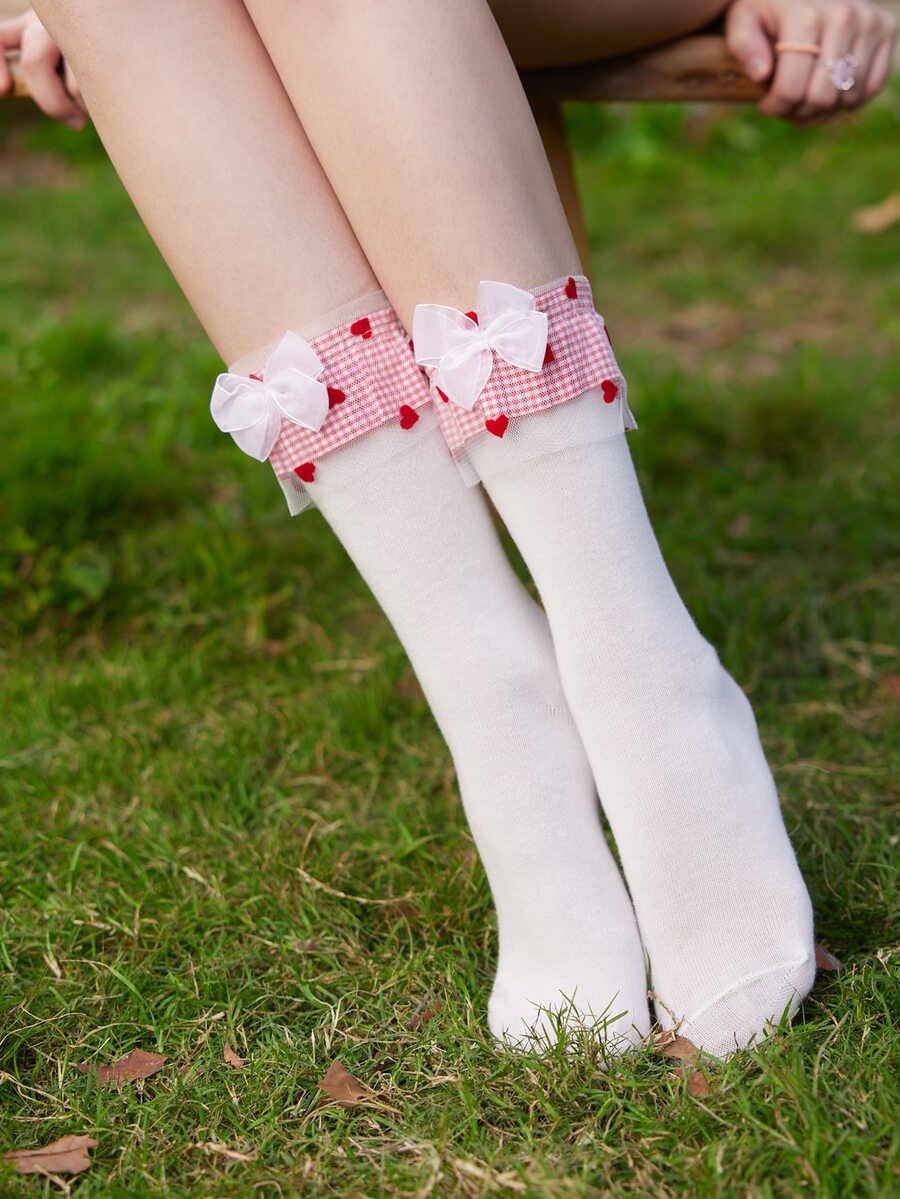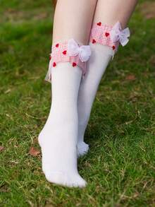 Kawaii Plaid & Heart Print Bow Decor Crew Socks