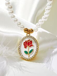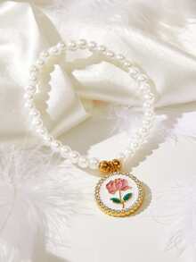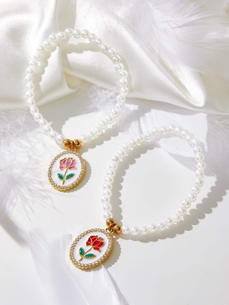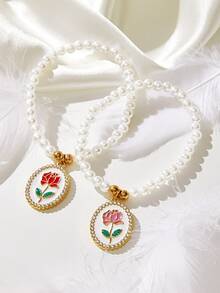 Sweetness 2pcs Flower Detail Oval Charm Faux Pearl Beaded Bracelet