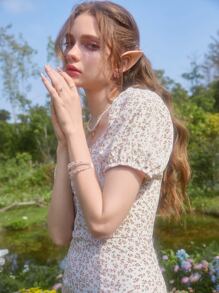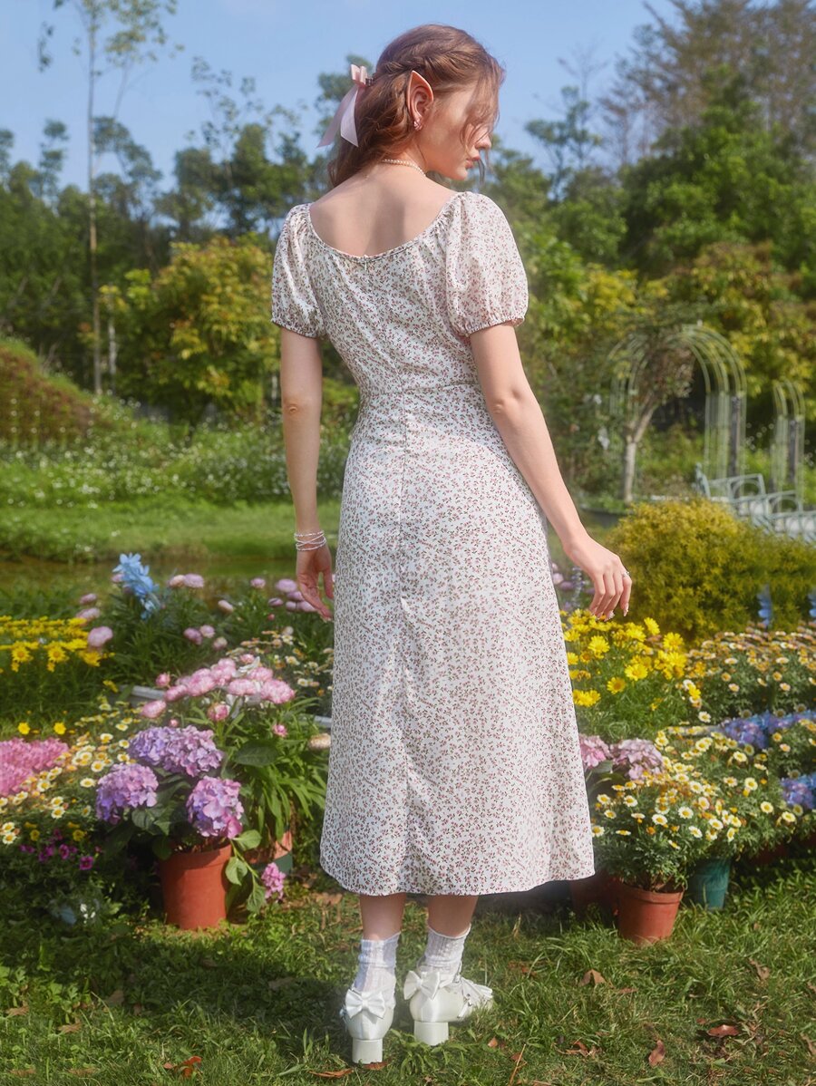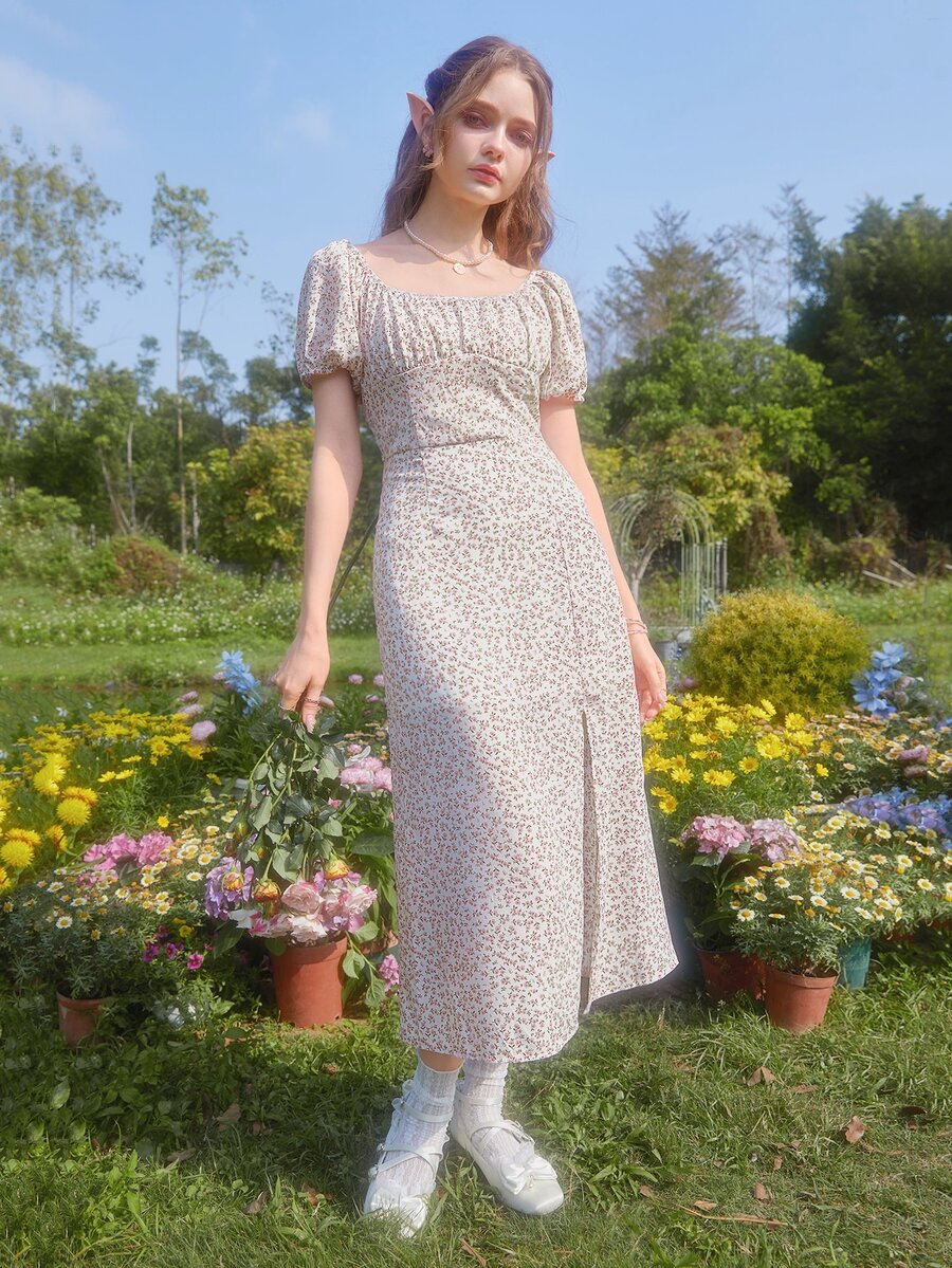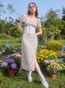 Ditsy Floral Print Puff Sleeve Split Thigh Dress Without Corset