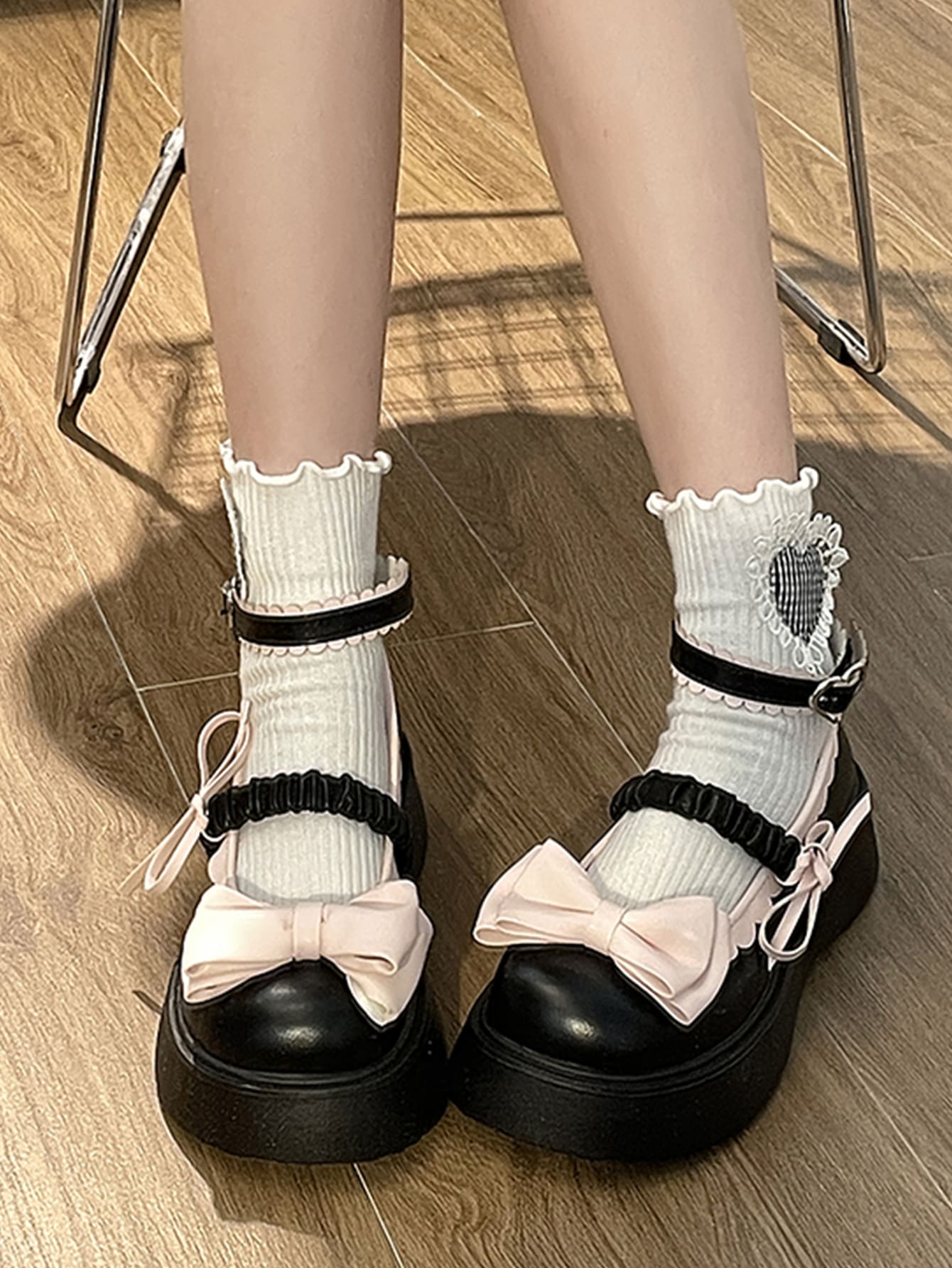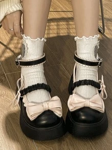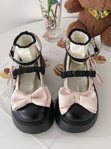 Sweetness Women Bow Decor Ruched Design Shoes, Preppy Black Court Wedges