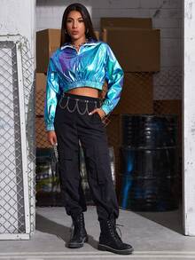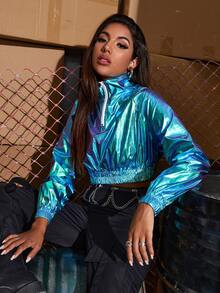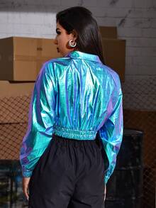 Raglan Sleeve Zip Half Placket Holographic Crop Jacket