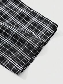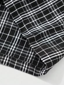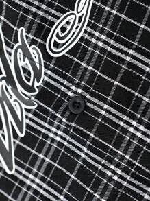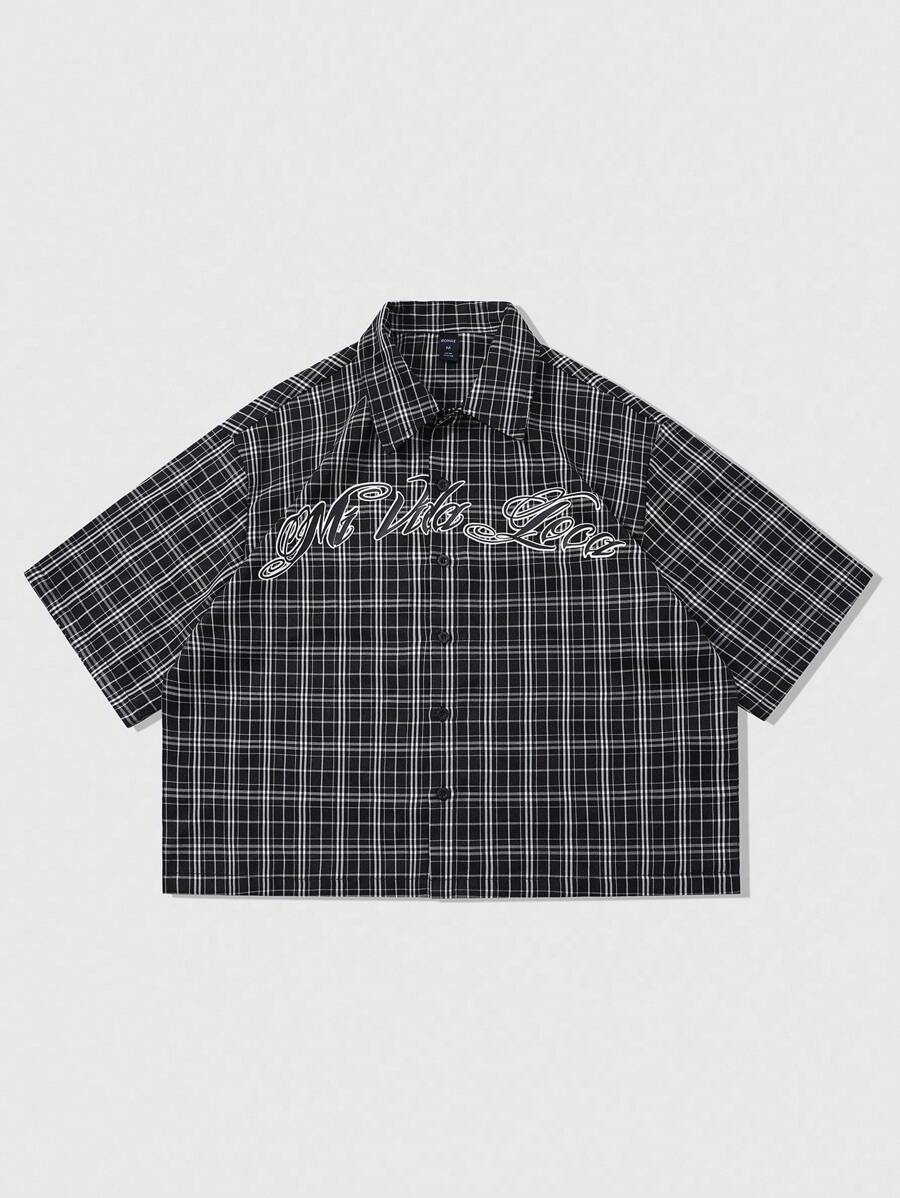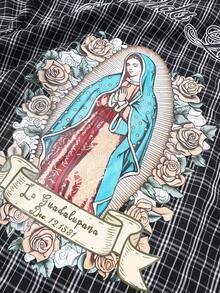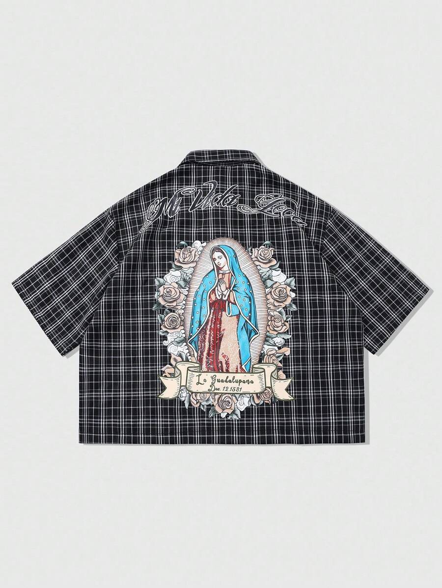 Street Life Retro American Plaid Short Sleeve Shirt, Classic Black & White Color, Back Print Of Virgin Mary Rose