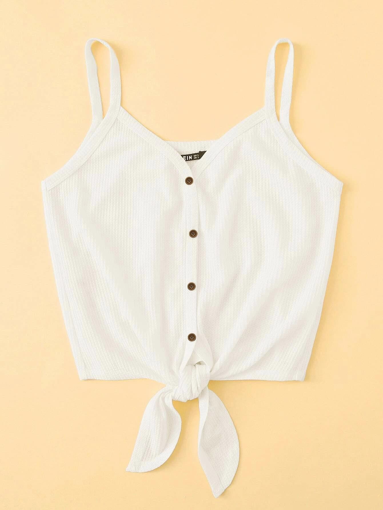 Ribbed Button-Front Knotted Cami Top