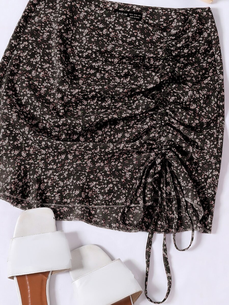 Ruched Knot Ruffle Hem Ditsy Floral Skirt