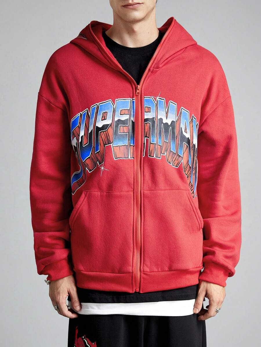 SUPERMAN X ROMWE Men's Logo & Letter Graphic Oversized Dropped Shoulder Zip-Up Hoodie