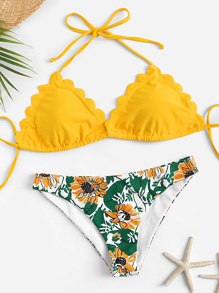 Scallop Trim Halter Top With Plants Print Bikini Set