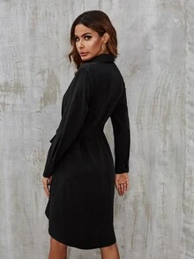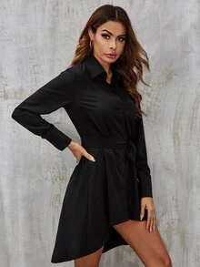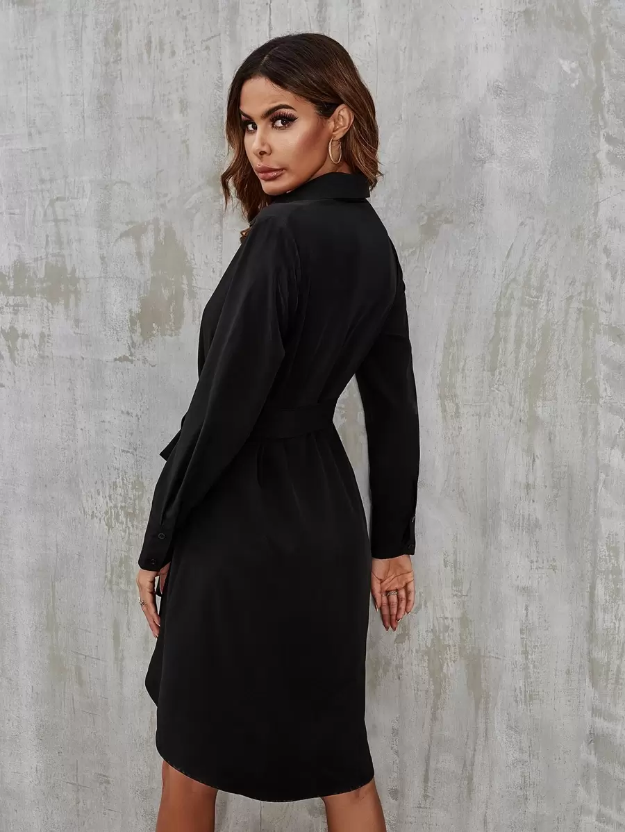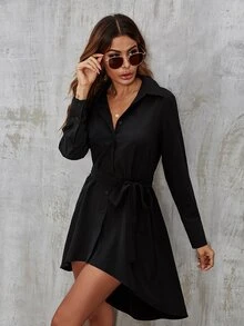 Self Tie Button Front High Low Shirt Dress