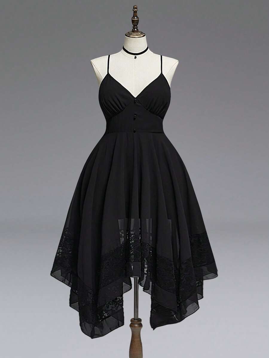 Sexy Gothic Deep V Flare Sleeve Asymmetrical Hem Contrast Lace Waist Maxi Dress
