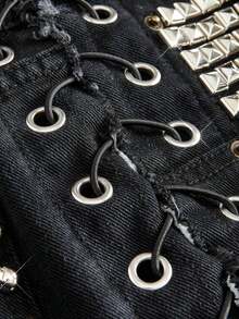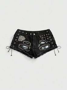 Grunge Punk Sexy Rivet Distressed Vintage Lace-Up Low Waist Frayed Denim Shorts For Plus Size Women, Suitable For Music Festival And Party