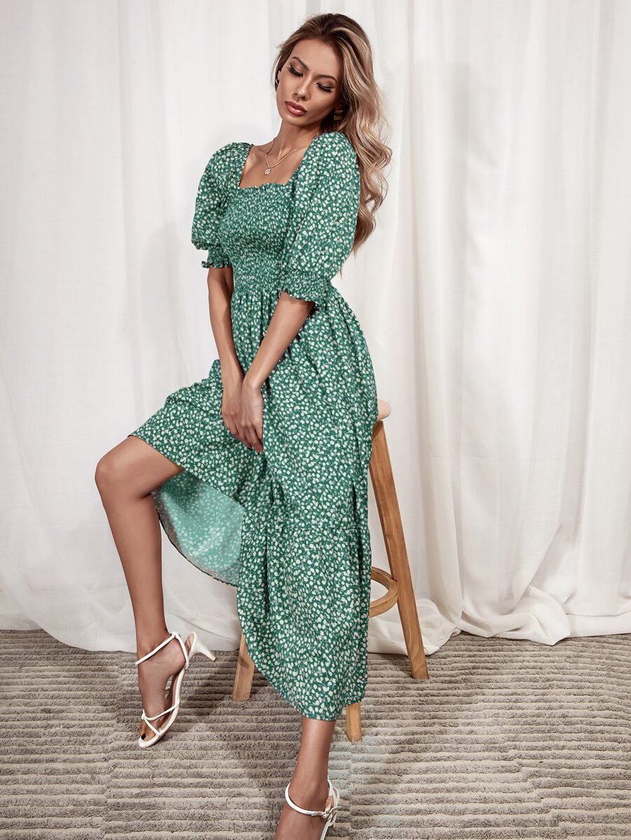 Shirred Ruffle Hem Square Neck Ditsy Floral Print Dress