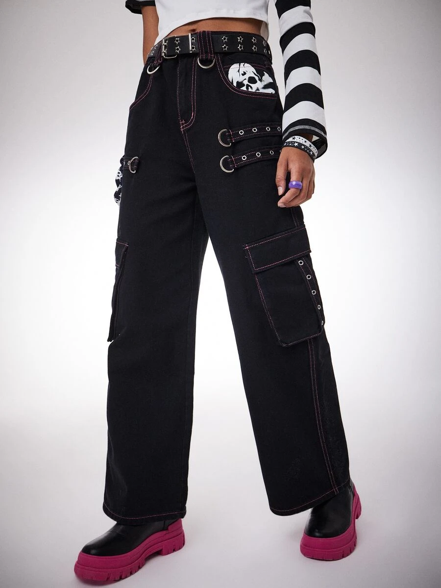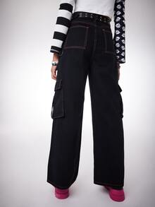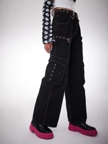 Skull Graphic Contrast Stitch Flap Pocket Cargo Jeans Without Belt