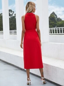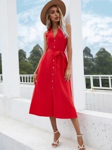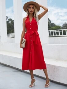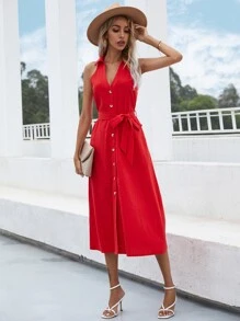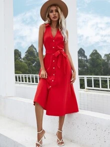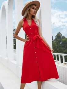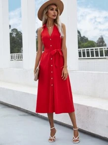 Solid Button Front Belted Sleeveless Shirt Dress