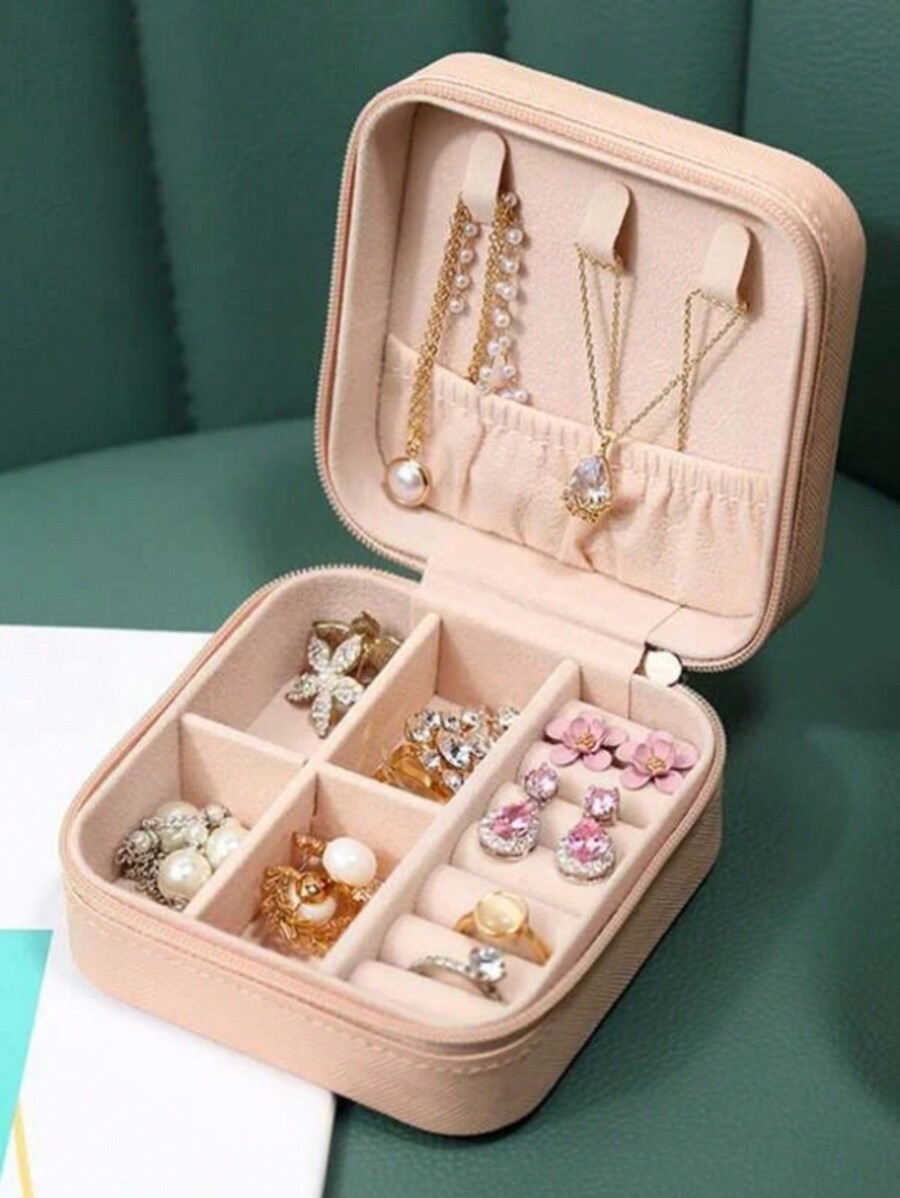 Solid Color Zipper Closure Portable Jewelry Box With Divided Compartments, Storage Box