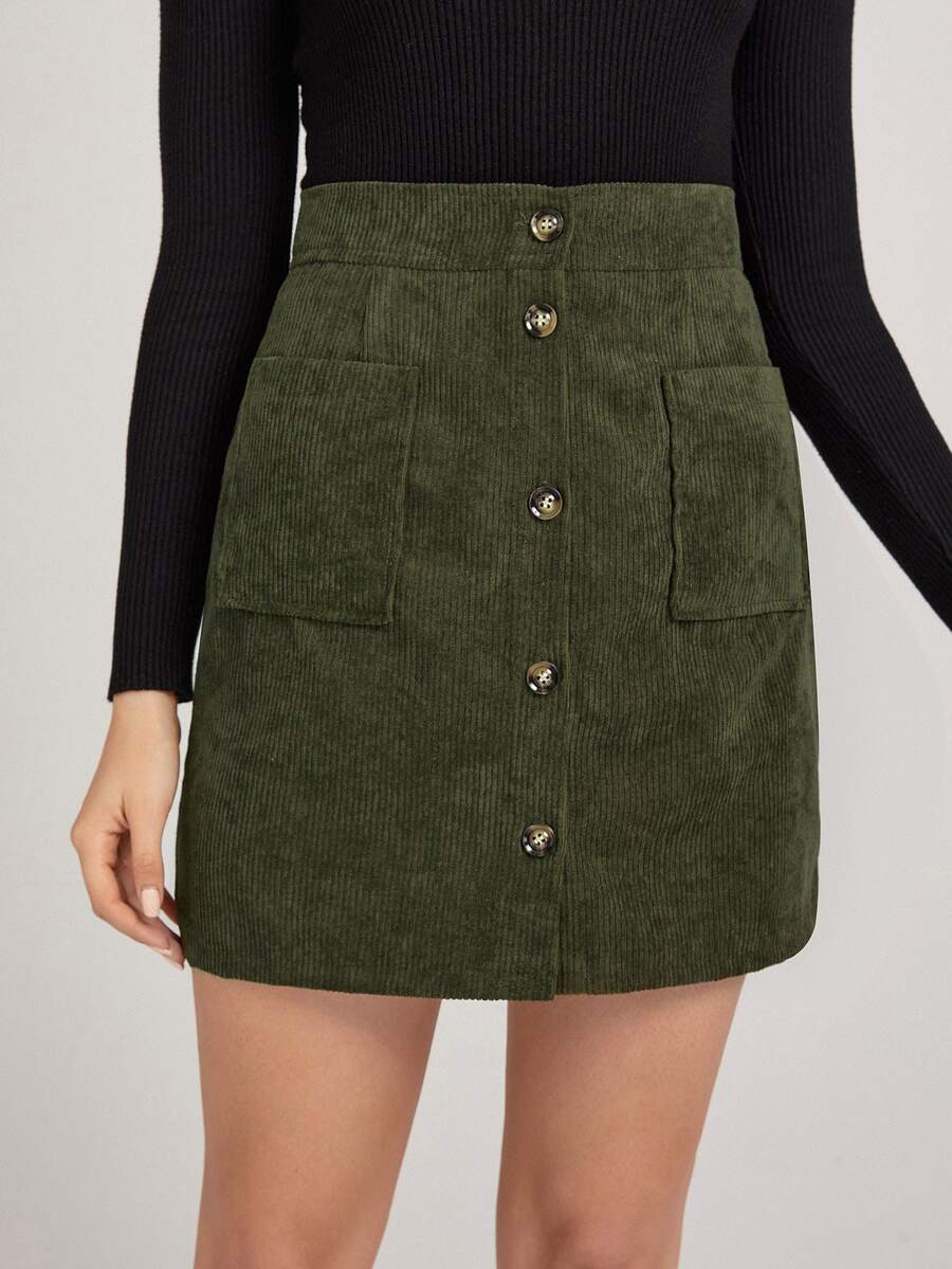 Solid Corduroy Button Front Pocket Skirt